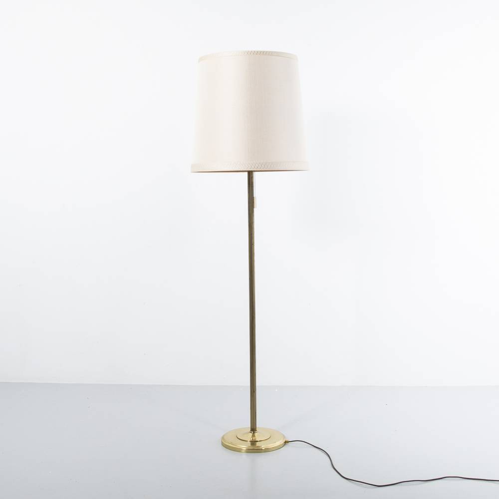Klassische Stehlampe mit Messingfuss. Leichte Patina am Metall, Stoffschirm in cremerose. Der Durchmesser des Fusses misst 30 cm, der Lampenschirm misst 50 cm.