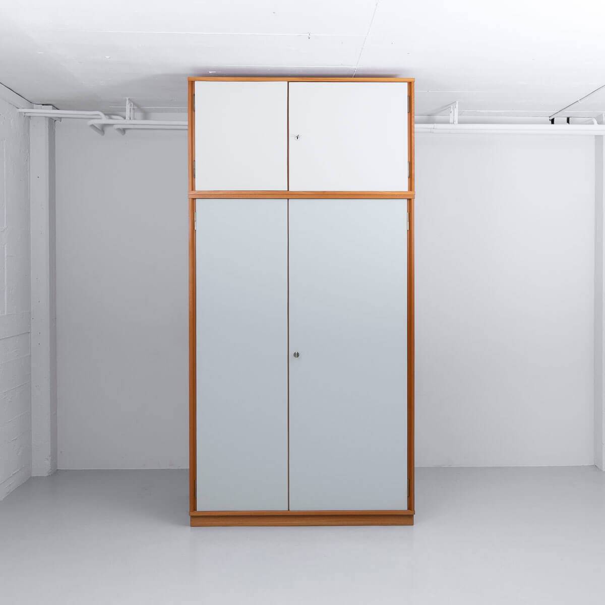 Kleiderschrank Esche Lino Blau/ Creme. Hergestellt aus Holzwerkstoff mit Furnier in Esche, in unserer Werkstatt wurden die unteren Fronten mit blassblauem Linoleum beklebt, die oberen Fronten wurden mit cremeweissem Linoleum beklebt. Unten vier feste Tablare, eine Kleiderstange und ein grosses Tablar, oben ein grosses Tablar. Abschliessbar, zwei Schlüssel. Guter Zustand.