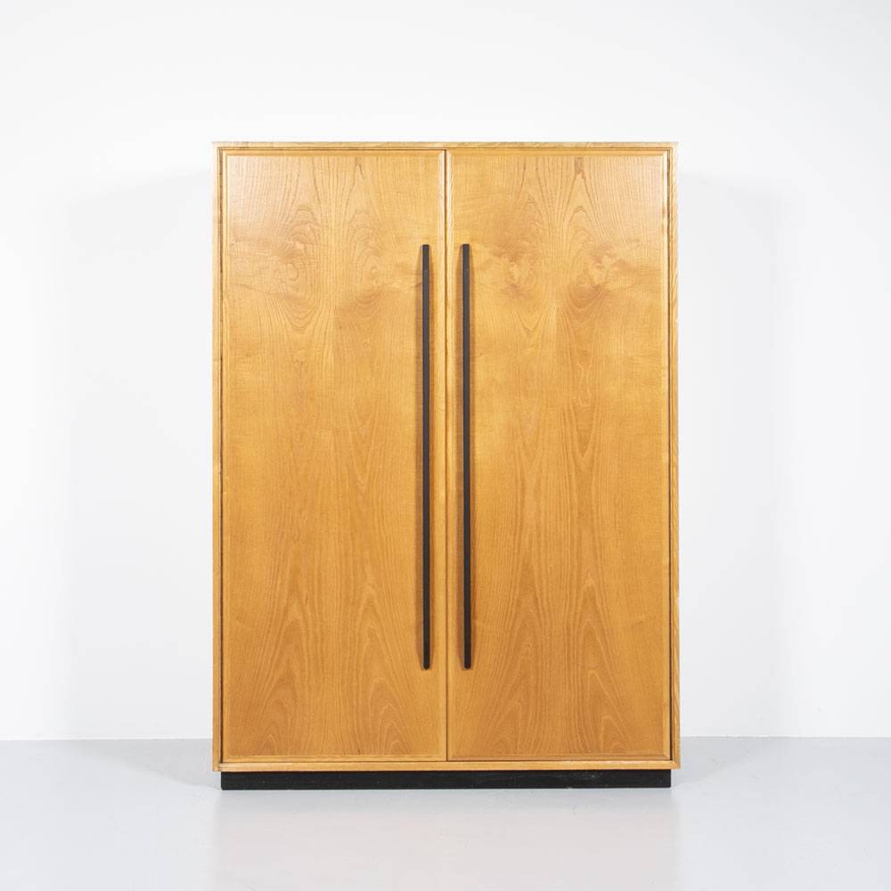 Kleiderschrank mit schwarzen Griffen. Schwarz lackierter Sockel, Korpus und Türen aus Holzwerkstoff mit Furnier in Esche, schwarz lackierte Griffe. Innen eine Kleiderstange und vier fest montierten Tablaren. Guter Zustand.