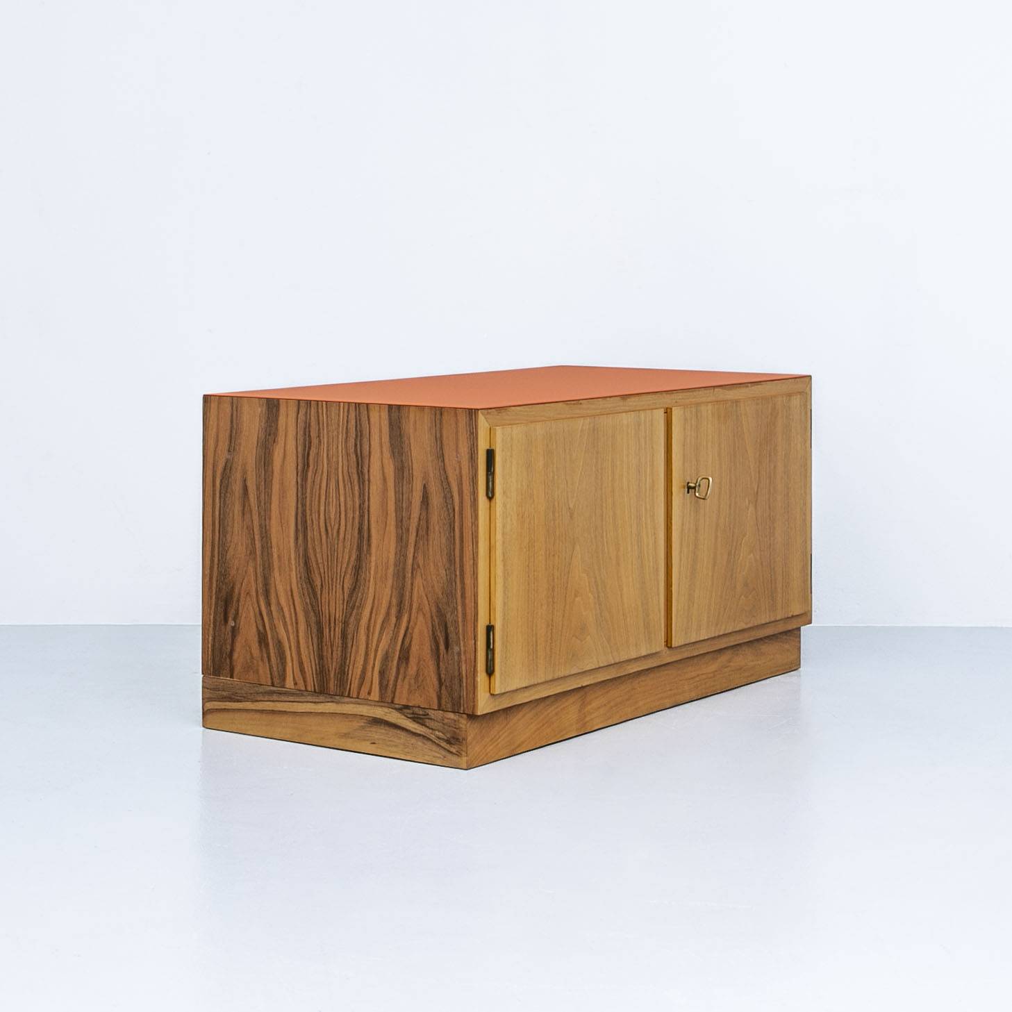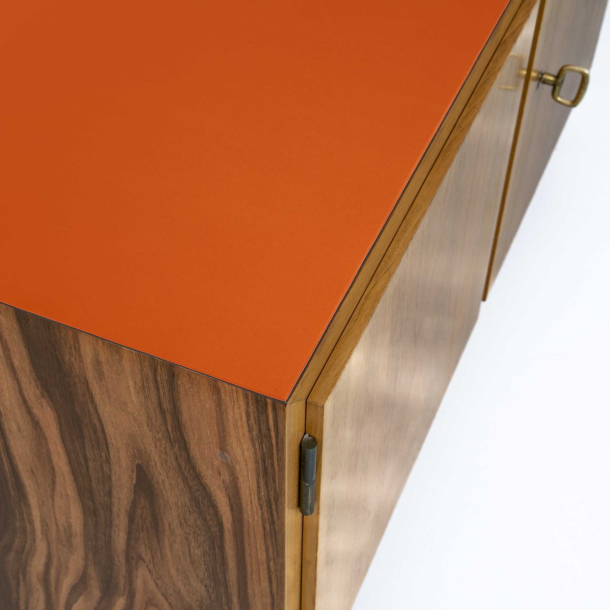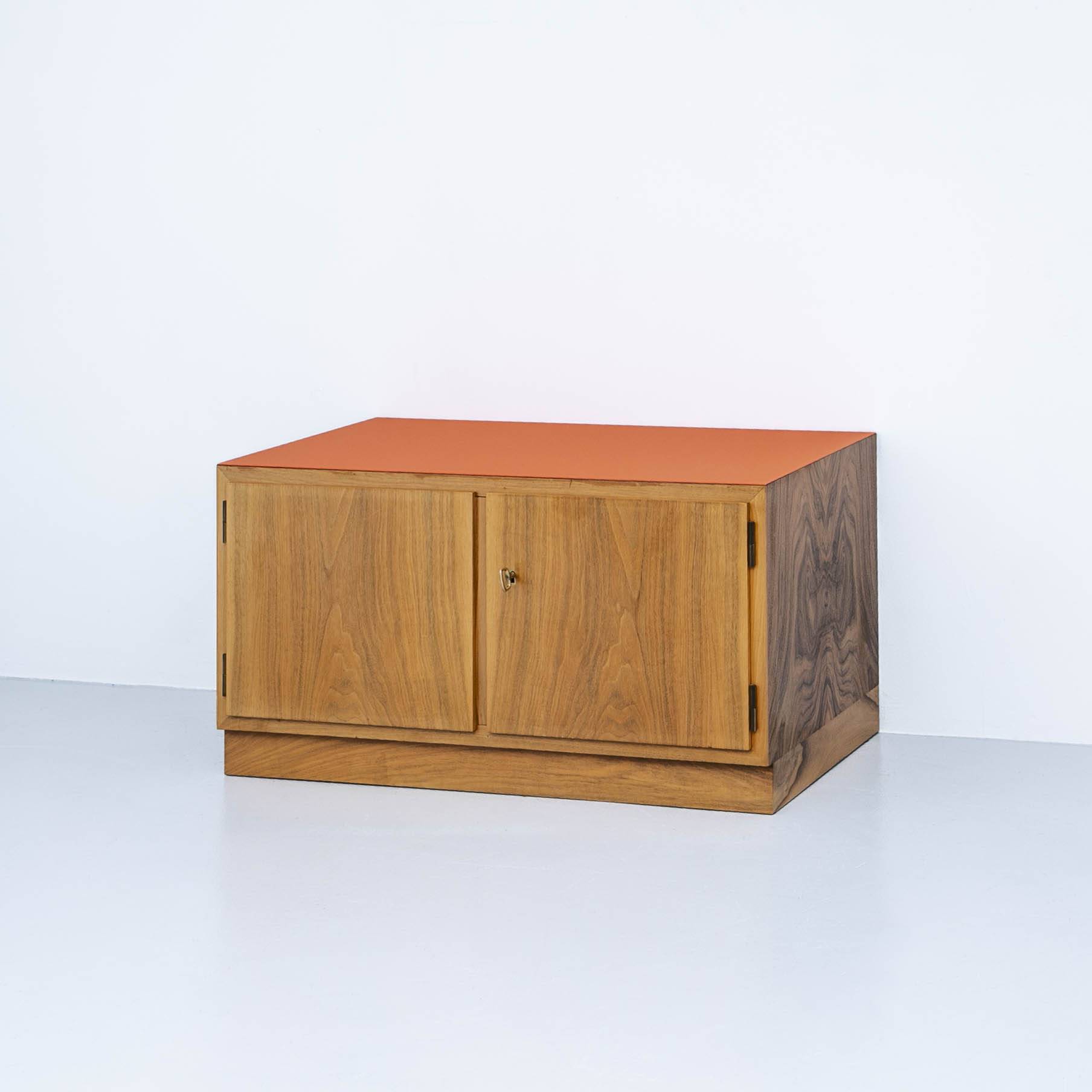 Kleine Nussbaumkommode/ Lino nach Wahl. Korpus und Fronten aus Holzwerkstoff, mit Furnier in Nussbaum. In unserer Werkstatt wird die Platte mit Linoleum nach Wunsch beklebt. Abschliessbar. Innen ein höhenverstellbares Tablar.