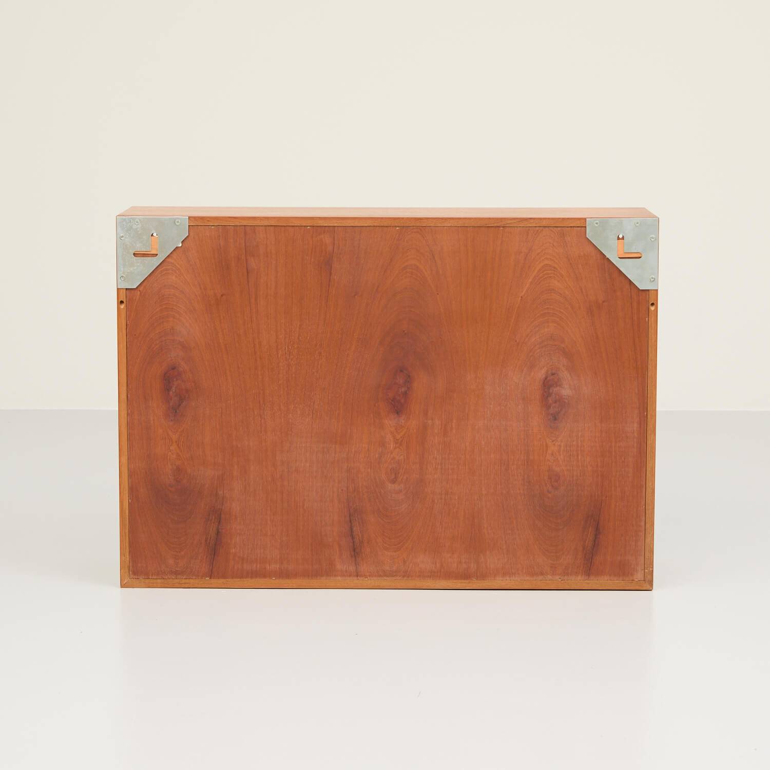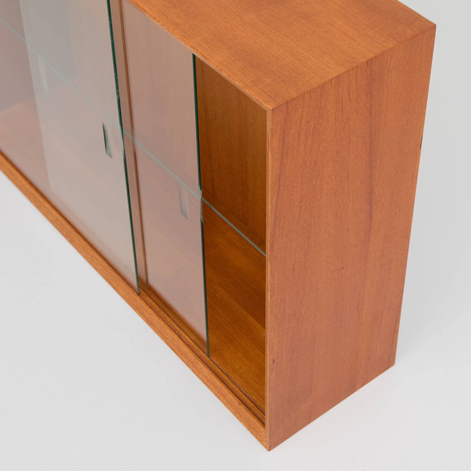 Kleine Wandvitrine aus furniertem Holzwerkstoff mit Glasschiebetüren. Ein Tablar. Mit Wandaufhängung auf der Rückseite. Guter Zustand.