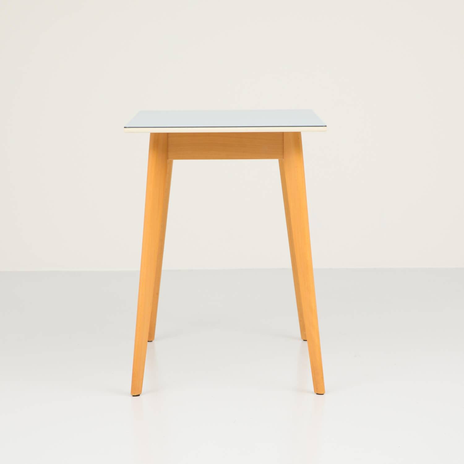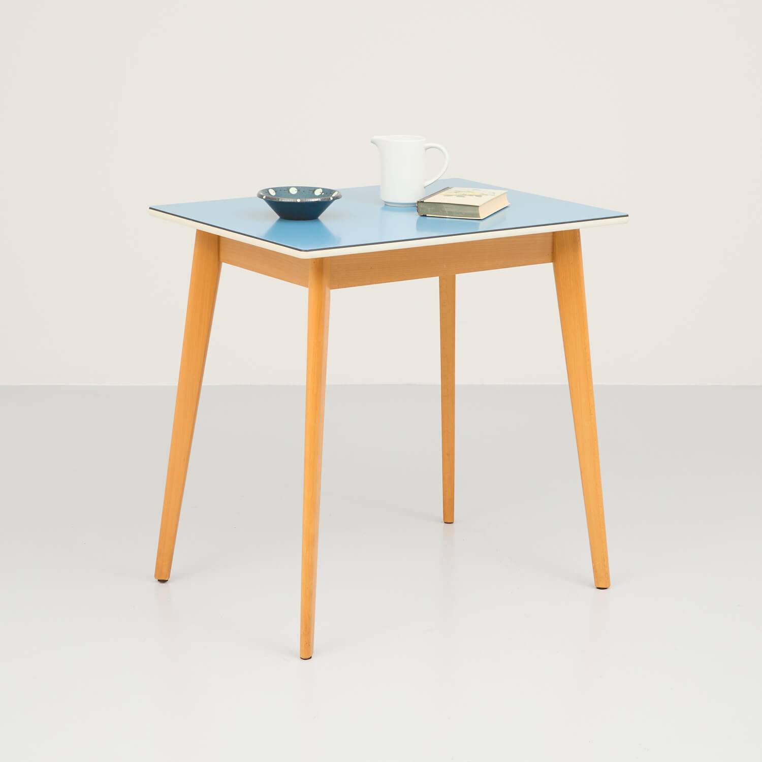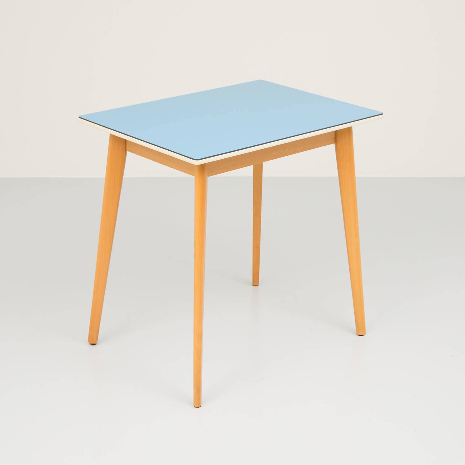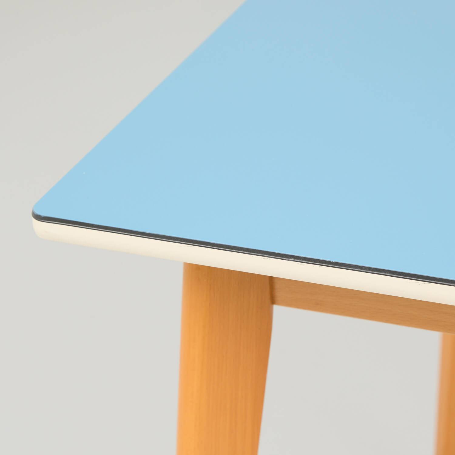 Kleiner Küchentisch mit hellblauer Kunstharzplatte mit weisser Kante. Gestell aus Buchenholz lackiert. Sehr guter Zustand.