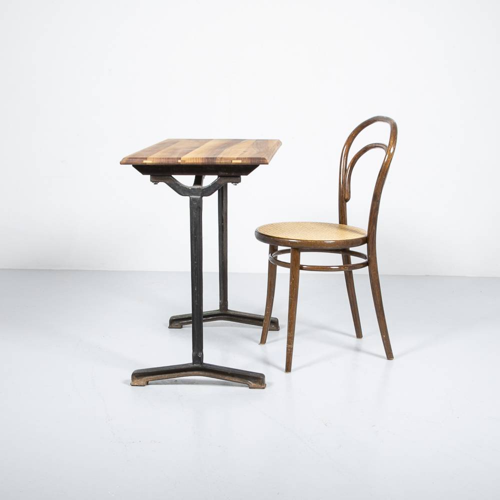 Kleiner Nussbaumtisch mit Gusseisenbeine. Platte aus massivem Nussbaum, geschliffen und geölt mit Karniskante, Gestell mit Patina.