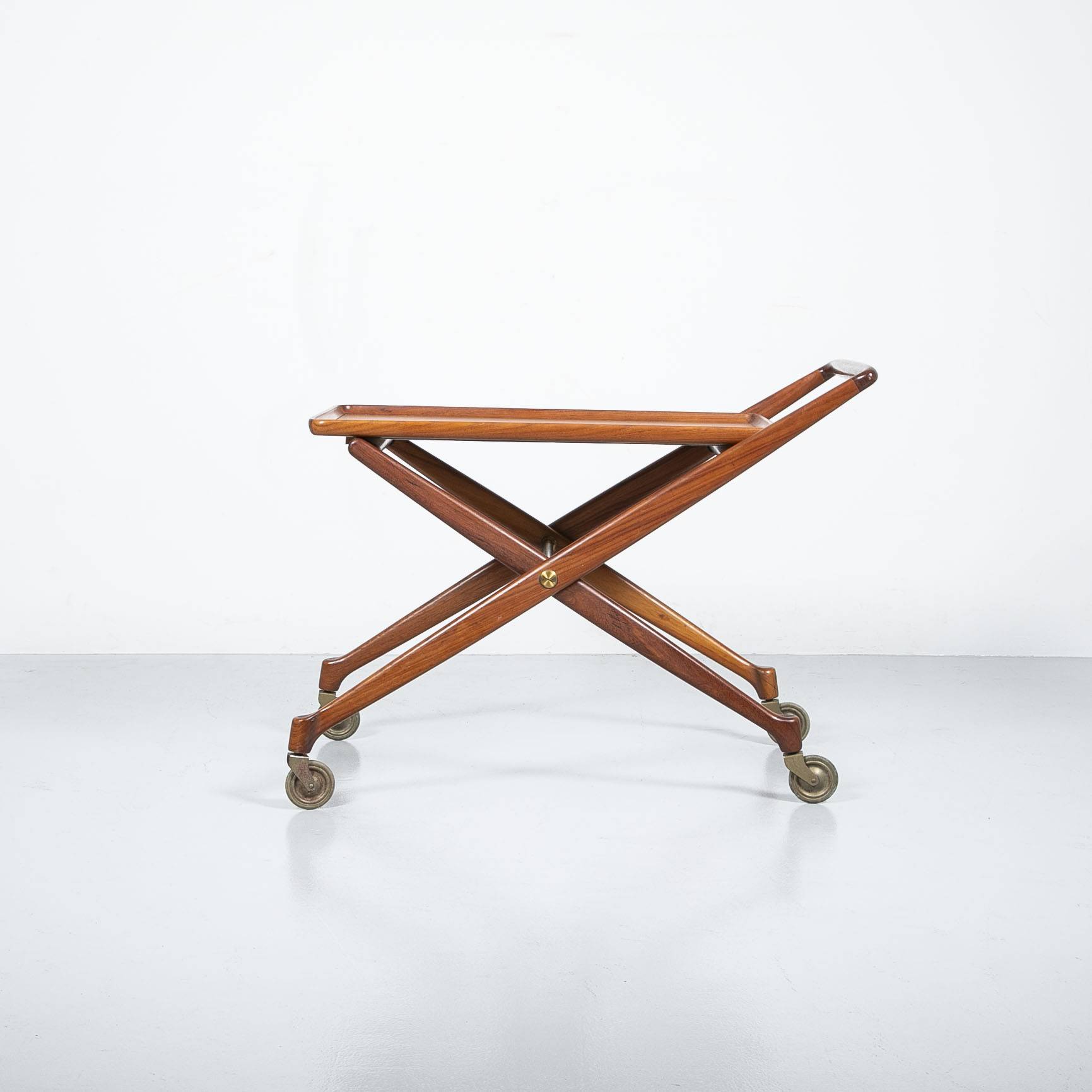 Knudsen & Son Servierwagen. Klappbares Gestell aus massivem Teakholz, Tablett aus Holzwerkstoff mit Furnier in Teakholz. Gebrauchsspuren an den Rollen.