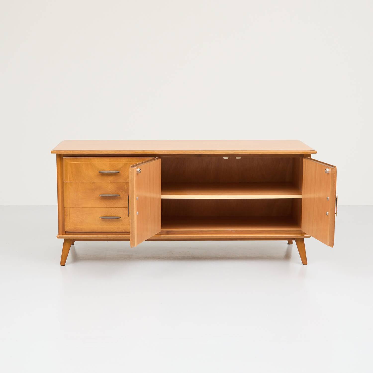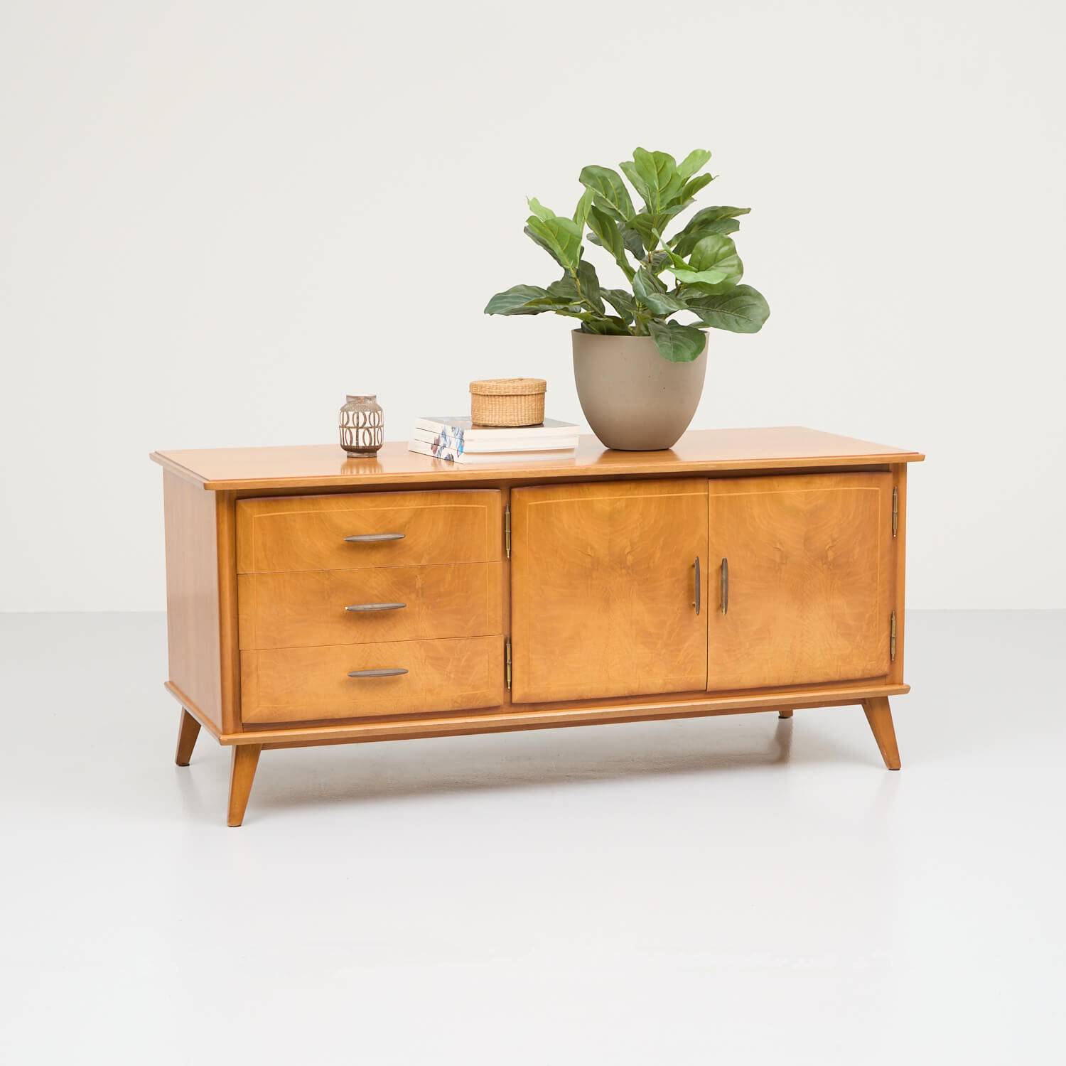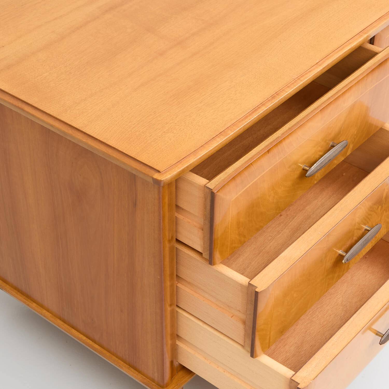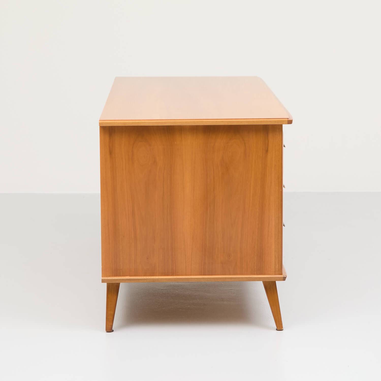 Kommode aus den 50er Jahren. Korpus und Füsse aus massivem Nussbaumholz, Fronten, Seiten und Deckblatt Holzwerkstoff Nussbaum furniert. Drei Schubladen links sowie ein Schrankteil rechts mit einem Tablar. Griffe aus Messing. Insgesamt sehr guter Zustand.