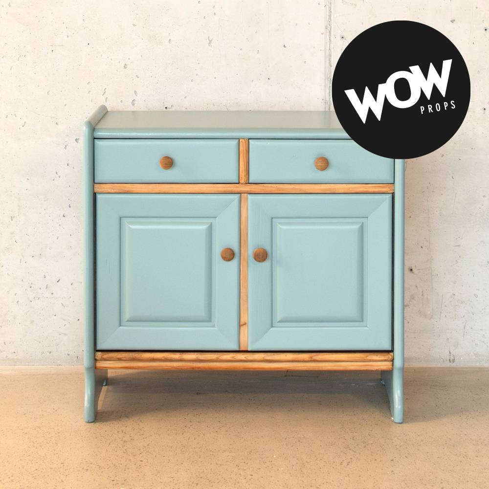 Kommode aus Holz in Hellblau. Diese gut erhaltene Kommode wurde in unserer Werksatt mit hellblauer Farbe umgestaltet. Sie ist ausgestattet mit zwei Schubladen, zwei Flügeltüren und schönen Holzgriffen. Im Inneren ist die Kommode mit einem nicht höhenverstellbarem Tablar bestückt.