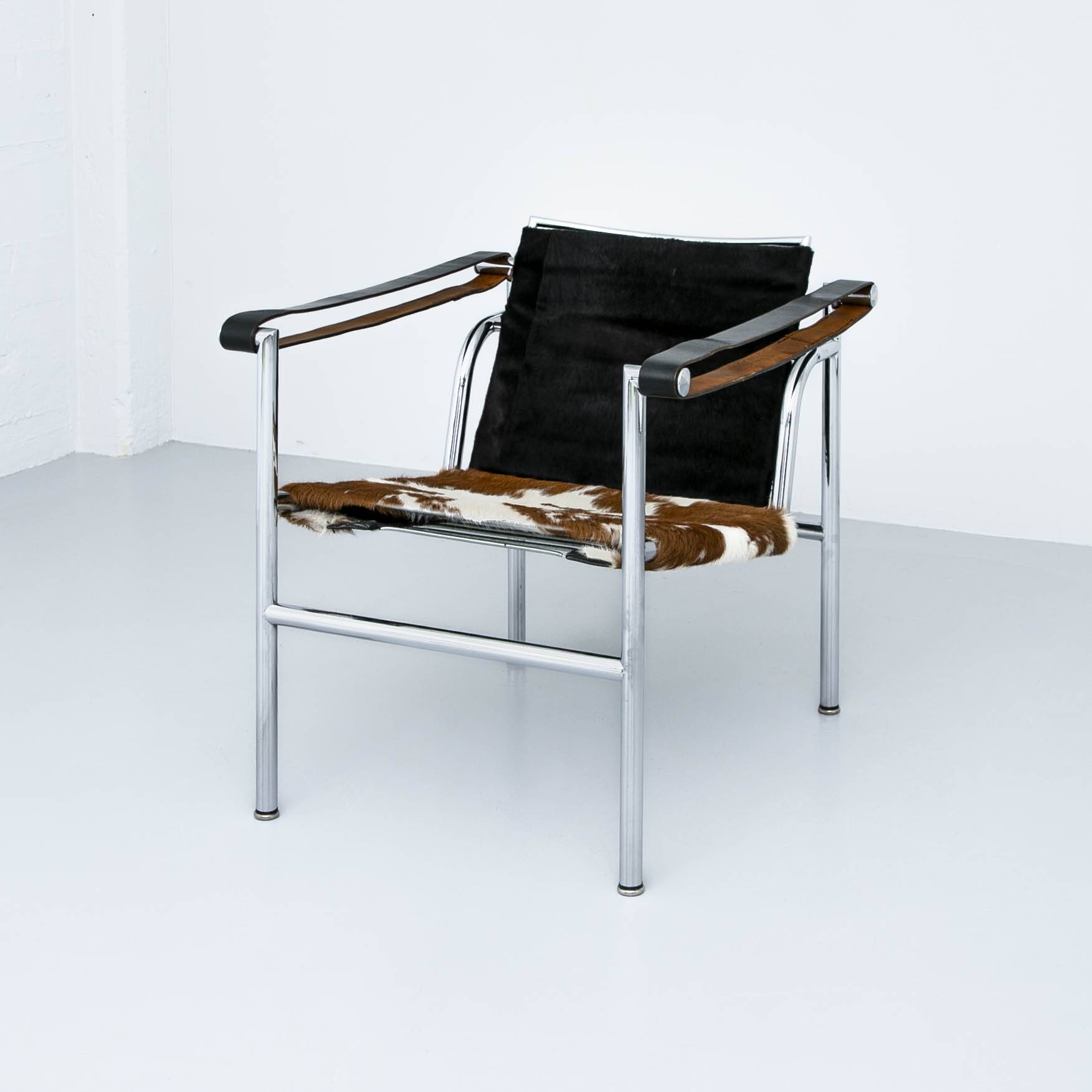 LC 1 mit Fellbezug, entworfen von Le Corbusier. Gestell aus verchromtem Stahl, Sitz- und Rückenfläche mit Fellbezug, Armlehnen aus Leder. Mit Gebrauchsspuren.