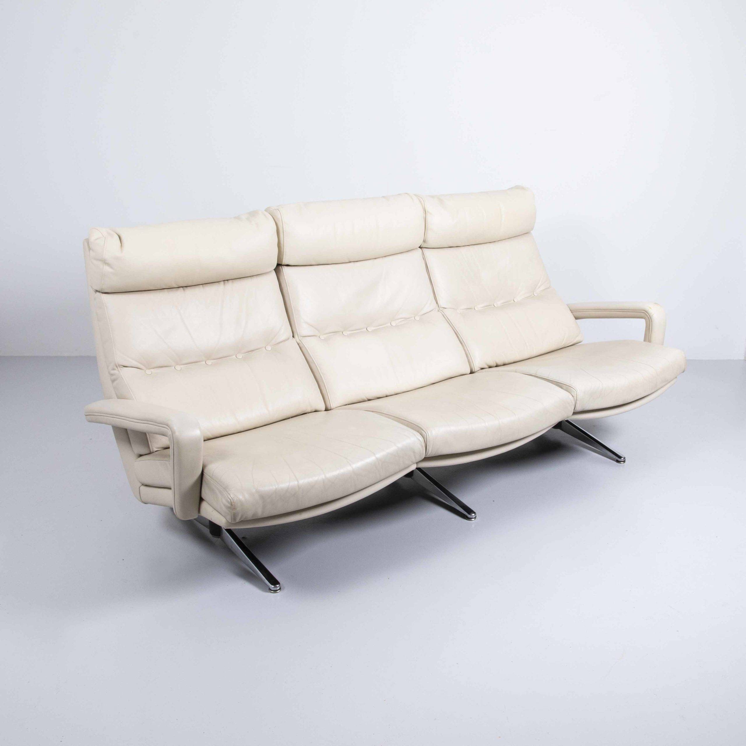 Bequemes dreisitzer Ledersofa mit hoher Rückenlehne und Armlehne. Weisses Leder auf Chromstahlkufen. Das Sofa steht in der Cafeteria Kalkbreitestrasse 10. Gerne erklären wir dir im Laden wo das ist.