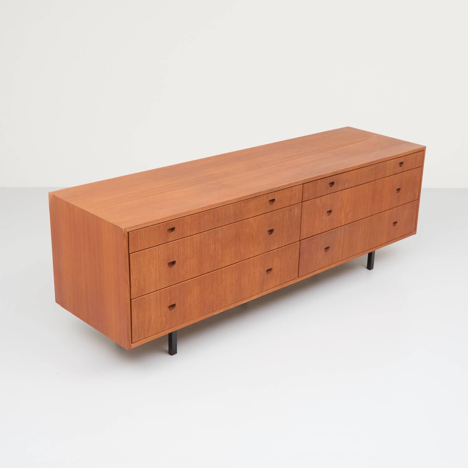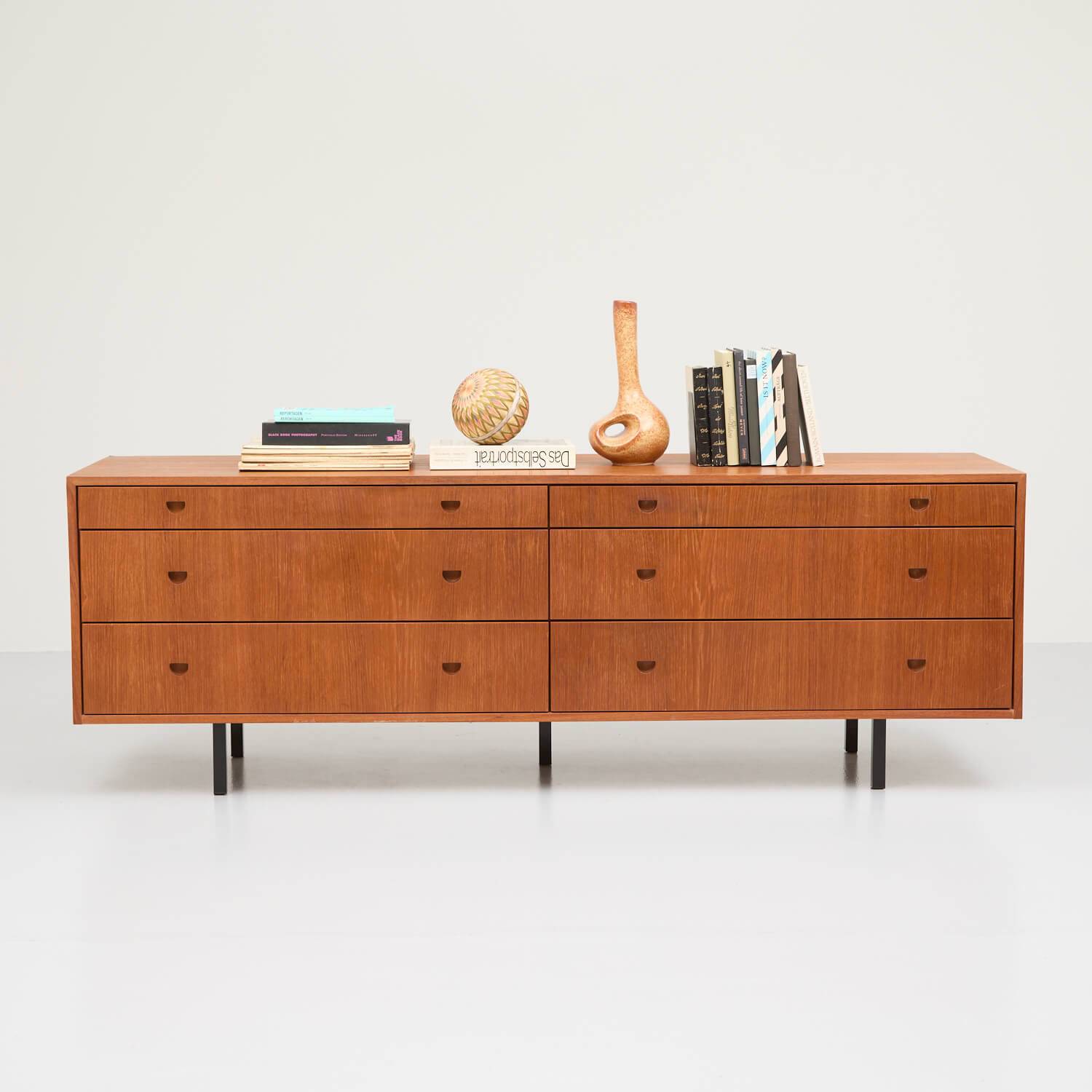 Lowboard aus Teakholz Mid Century Design. Korpus mit sechs Schubladen aus Holzwerkstoff furniert. Schubladenfronten mit Patina. Füße vierkant, schwarz Metall. Ecke im hinteren Bereich geflickt. Ansonsten guter Zusstand.