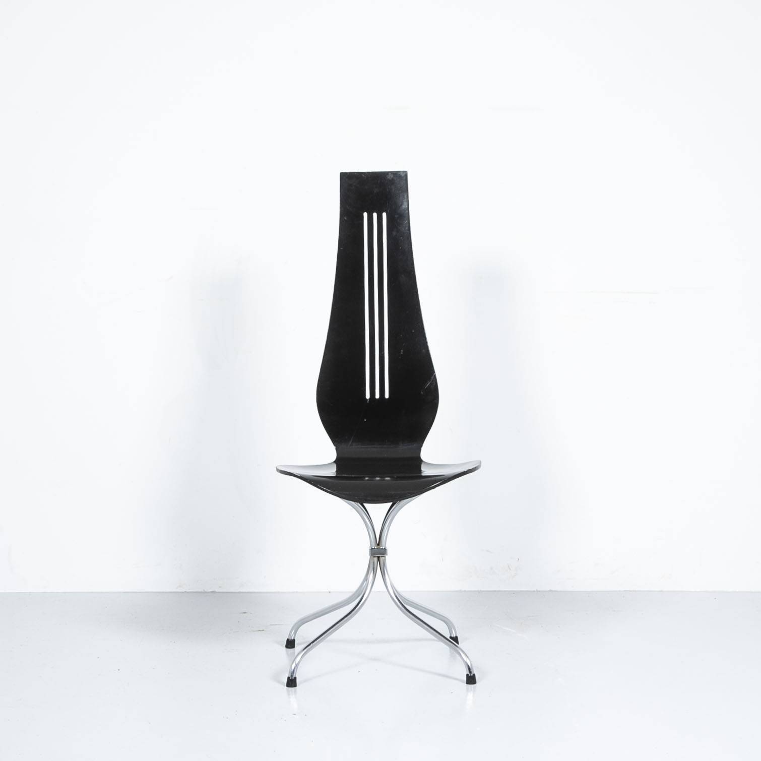 Lyra Stuhl von Theo Häberli. Bein aus verchromtem Stahl, Sitzschale aus schwarz lackiertem Formsperrholz. Mit Lackschäden. Preis pro Stück.