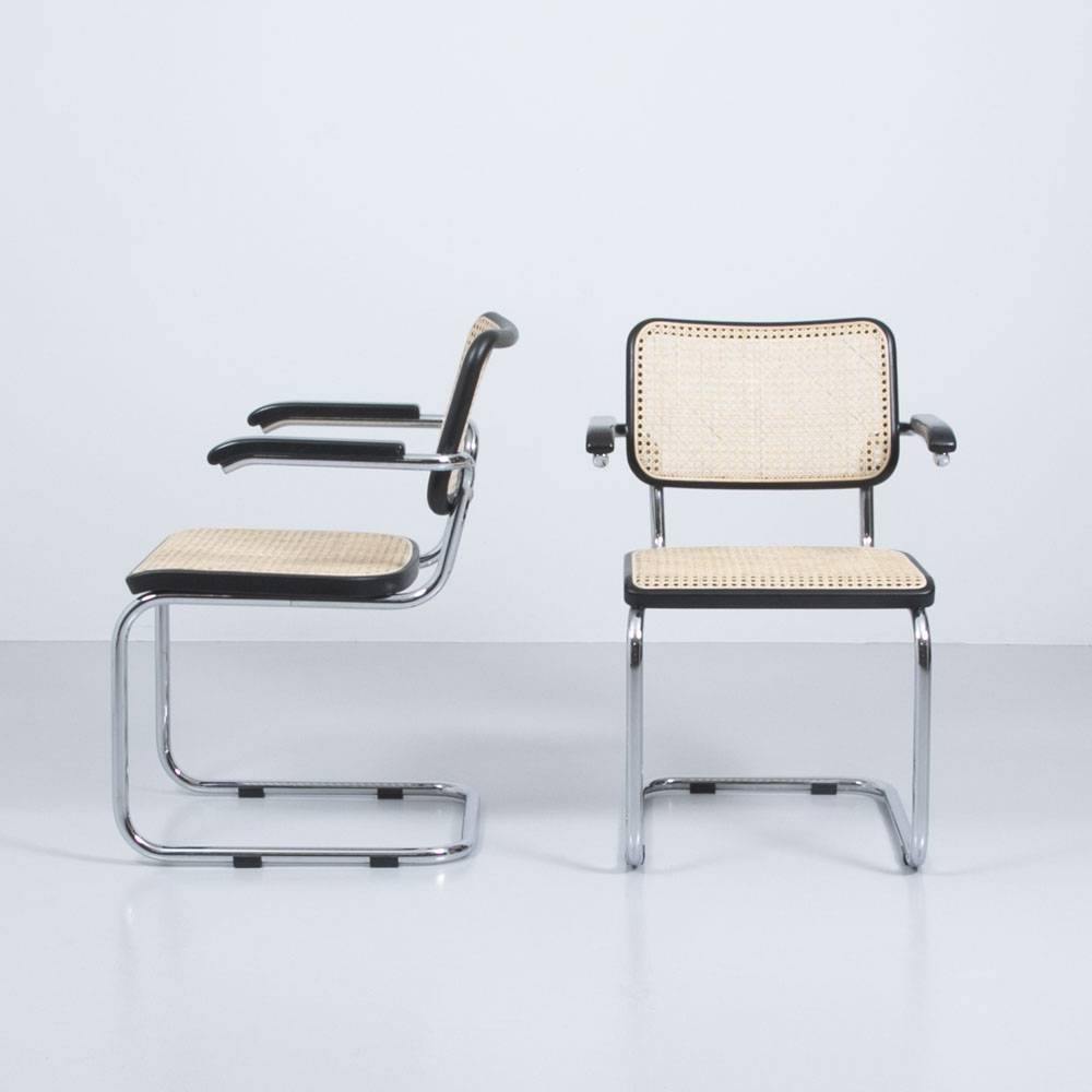Freischwinger S64 mit Armlehnen aus schwarz lackierter Buche mit Rohrgeflecht auf Chromstahlrahmen. Design Ende 1920 von Marcel Breuer. Hergestellt von Thonet. Neuwertiger Zustand. Rohrgeflecht wurde komplett erneurt.