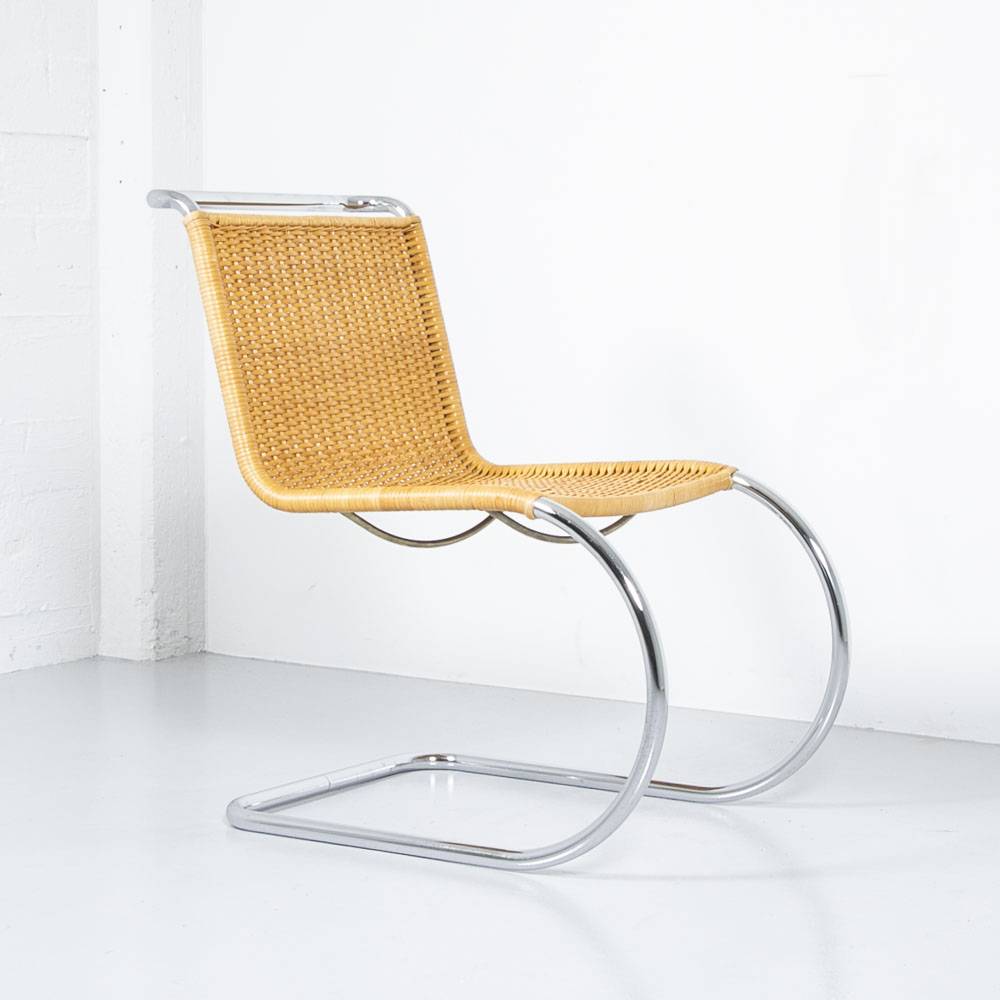 MR 10 Freischwinger Thonet, nach einem Entwurf von Mies van der Rohe aus den 1920er. Gestell aus verchromtem Stahl, Sitzfläche mit Rattanbespannung. Guter Zustand.