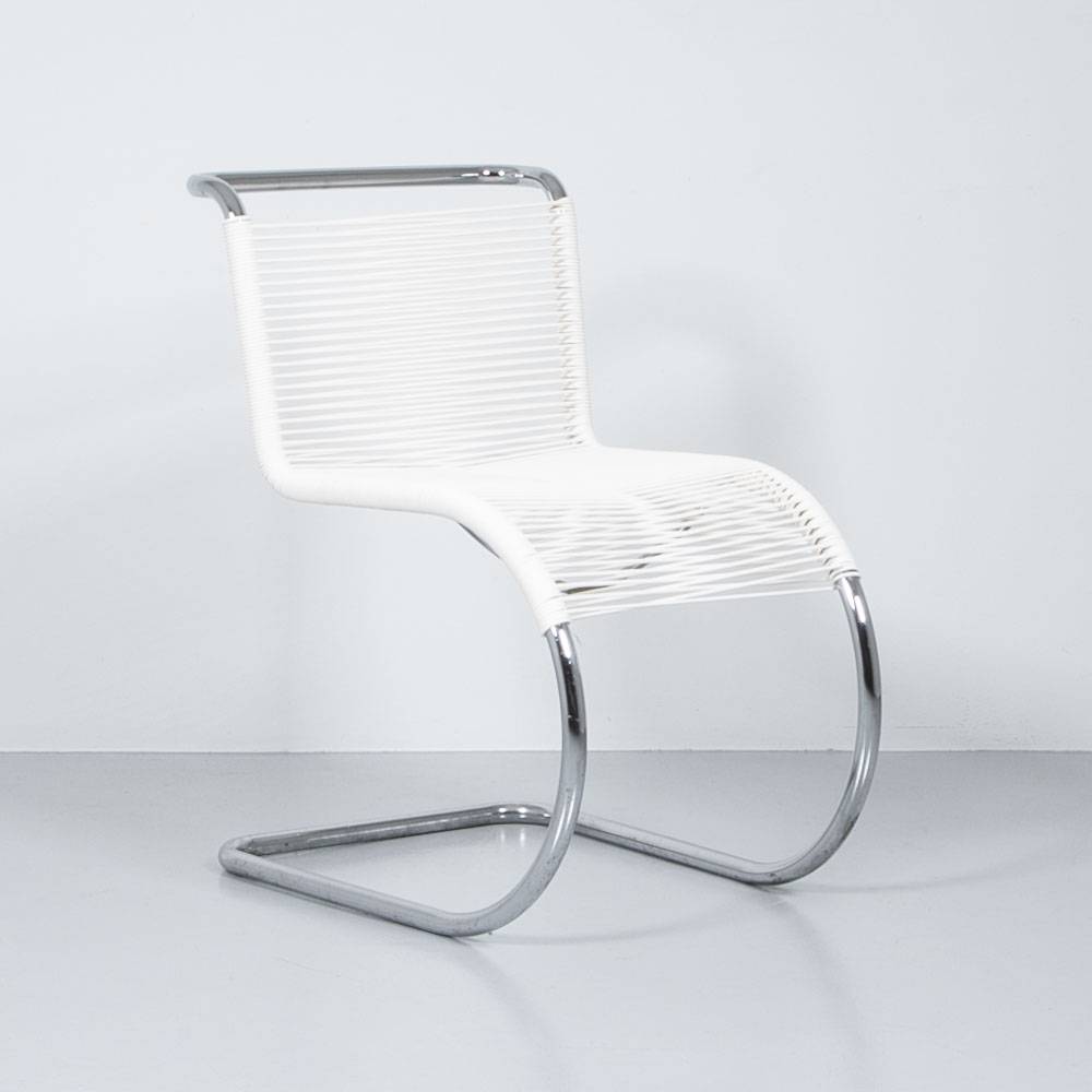 MR 10 Stuhl mit Spaghettibespannung. Replika nach einem Entwurf von Mies van der Rohe. Verchromtes Stahlrohrgestell, Bespannung aus weissem PVC.