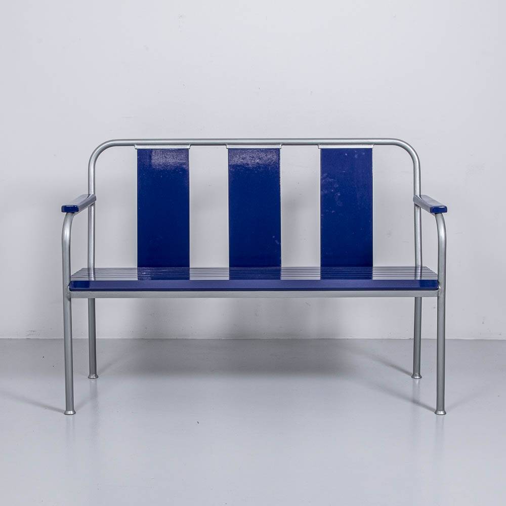 Gartenbank mit neuen Holzlatten, Die Holzlatten sind neu lackiert in RAL 5022 nachtblau.Silber lackiertes Metallgestell.