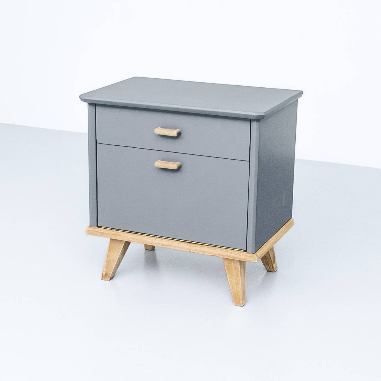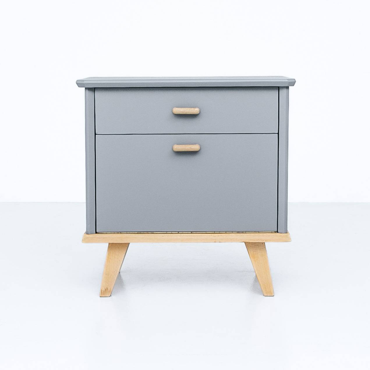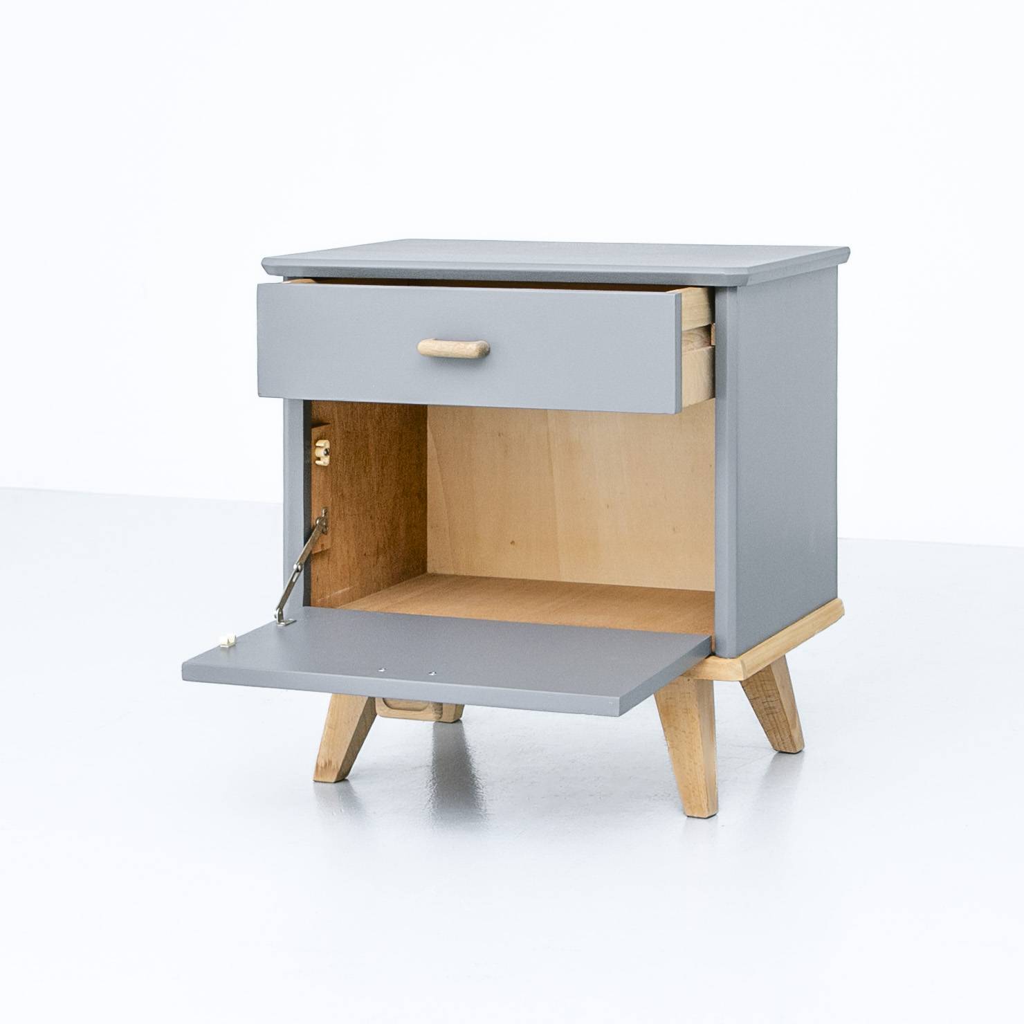 Nachttisch mit Schubade und Klapptür. Beine aus massiver Buche, Korpus aus Holzwerkstoff, in unserer Werkstatt neu lackiert.