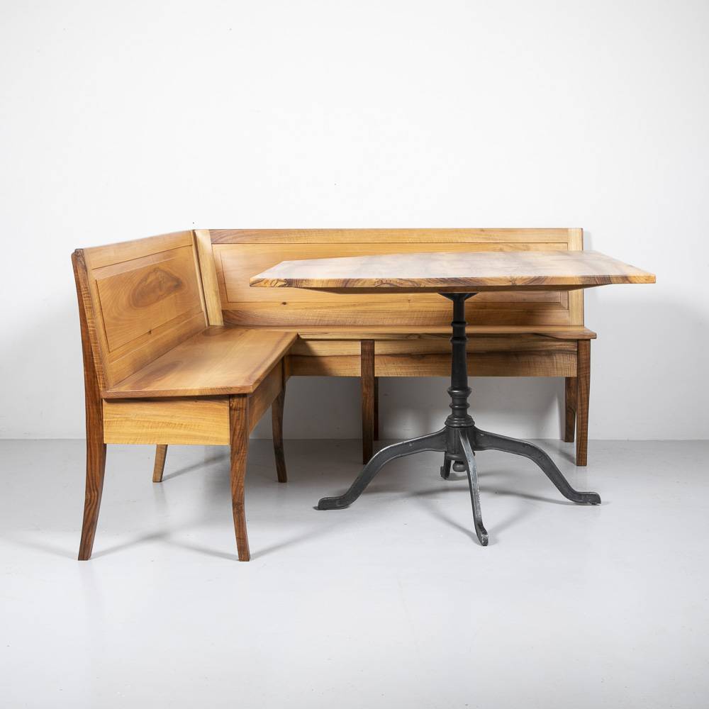 Nussbaum Kombination. Platte und Eckbank hergestellt aus massivem, geöltem Nussbaumholz, Tischgestell aus Gusseisen. Eckbank mit zwei Modulen, ein Modul 166 cm lang, ein Modul 152 cm lang Sitzhöhe 47 cm je eine Schublade an den Stirnseiten der Bank, innen aus massiver Eiche Tischplatte 120 x 104 cm