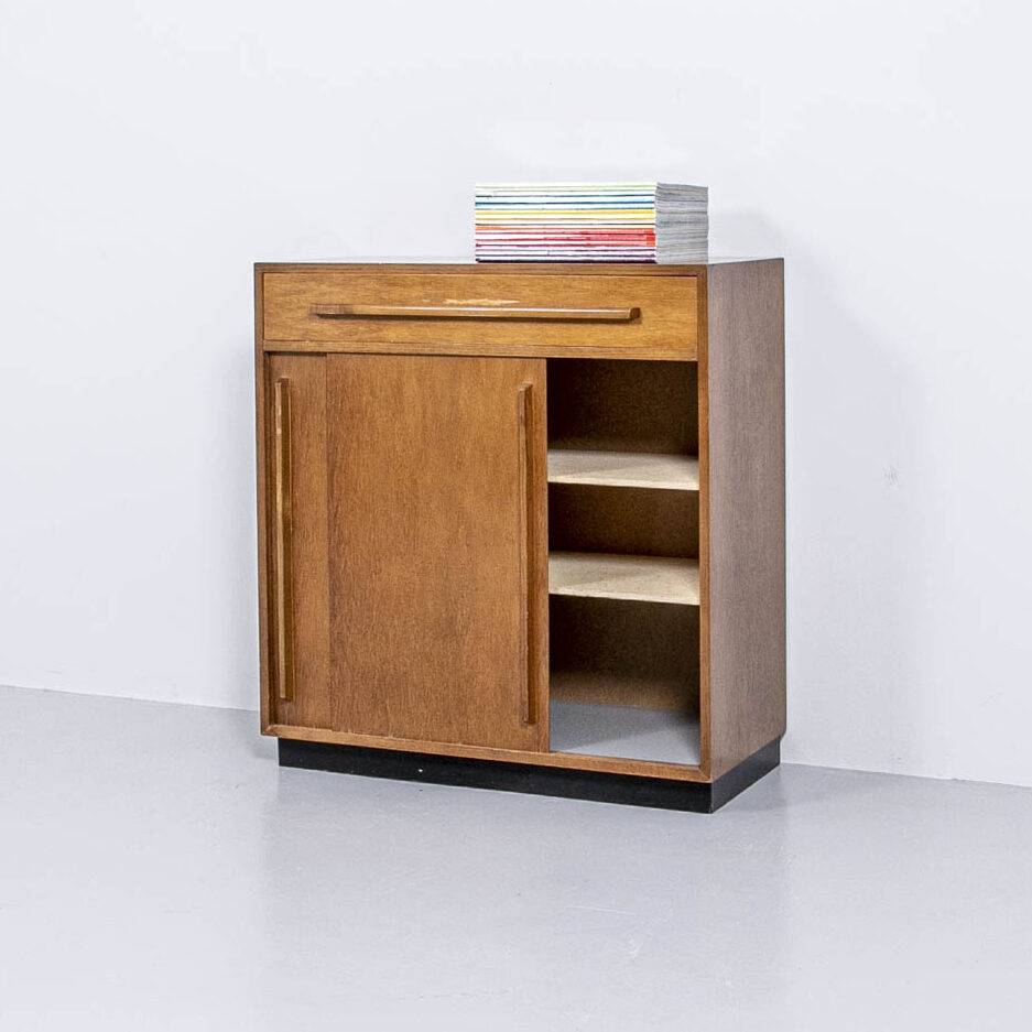 50er Jahre Schiebetürschrank mit Schublade aus Nussbaum Furnier und massivem Nussbaum. Innen zwei höhenverstellbare Tablare. Furnierschaden an der Schubladenfront.