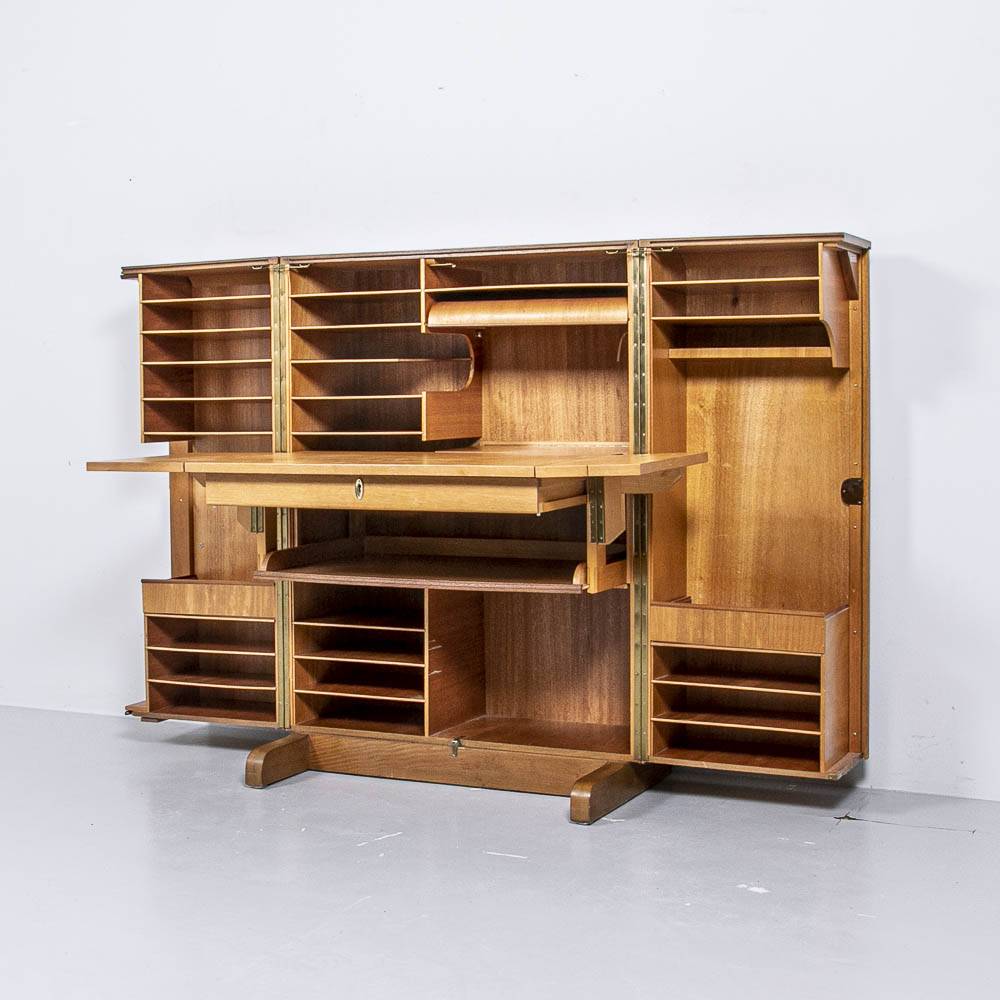 Kastenförmiger Sekretär mit klappbaren Seitenteilen und einer ausklappbaren Schreibunterlage. Türen und Schublade nicht abschliessbar. Aussen Nussbaum Furnier. Innen Teak- und Buche Furnier. Mit integrierter Beleuchtung. Unterer Türrigel muss zum öffnen händisch gelöst werden. Flecken und Kratzer au