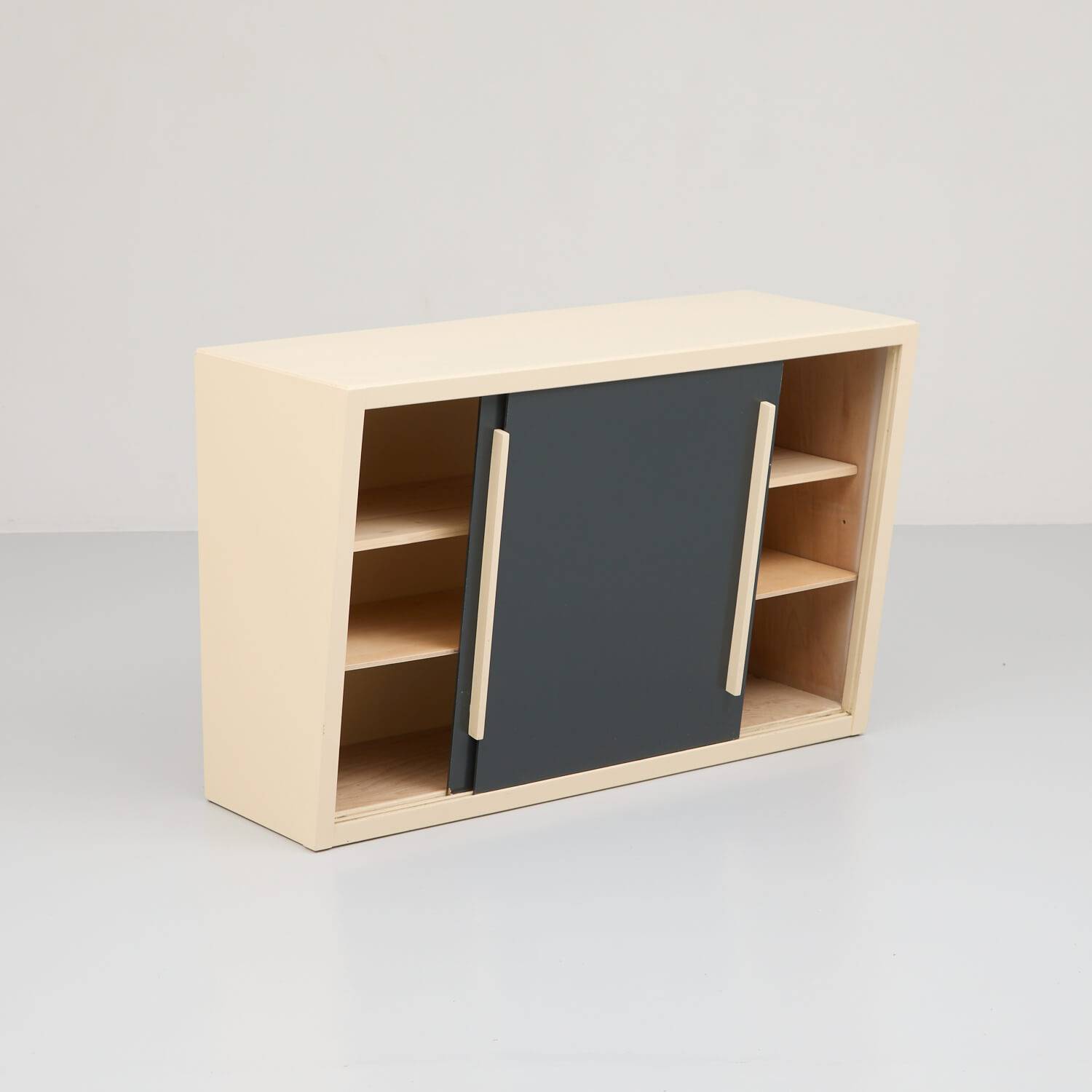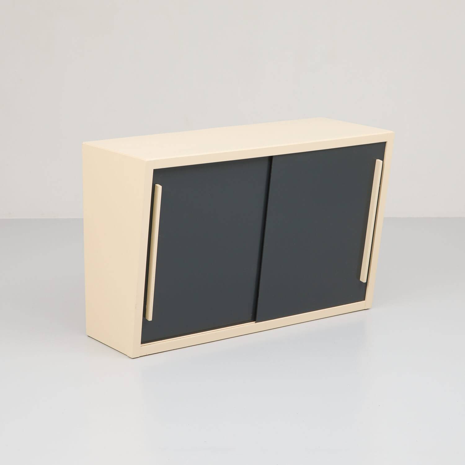 Oberteil Küchenschrank aus den 50er Jahren mit zwei Schiebetüren und zwei Tablaren. Lackiert in beige und dunkelgrau. Mit Gebrauchsspuren.