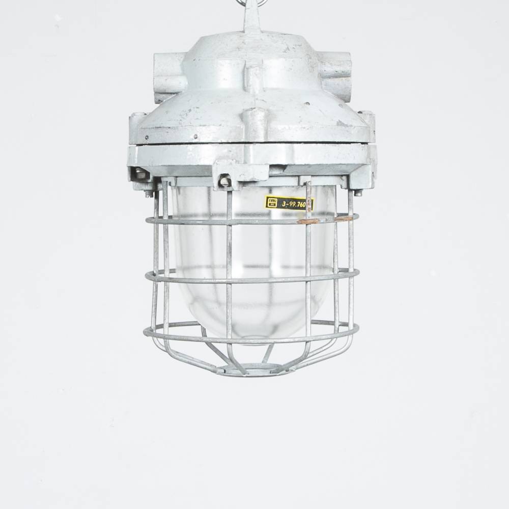 Ostdeutsche Industrielampe. Hängelampe aus grau lackiertem Gusseisen, feuerverzinktem Stahl und Schirm aus Klarglas. Mit Patina.