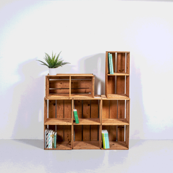 Holzkisten mit mittigem Tablar für Regalbau oder anderes. Preis für eine einzelne Kiste. Regal auf Bild aus 5 einzelnen Kisten zusammengestellt. Diese Kisten sind in der Micasa in