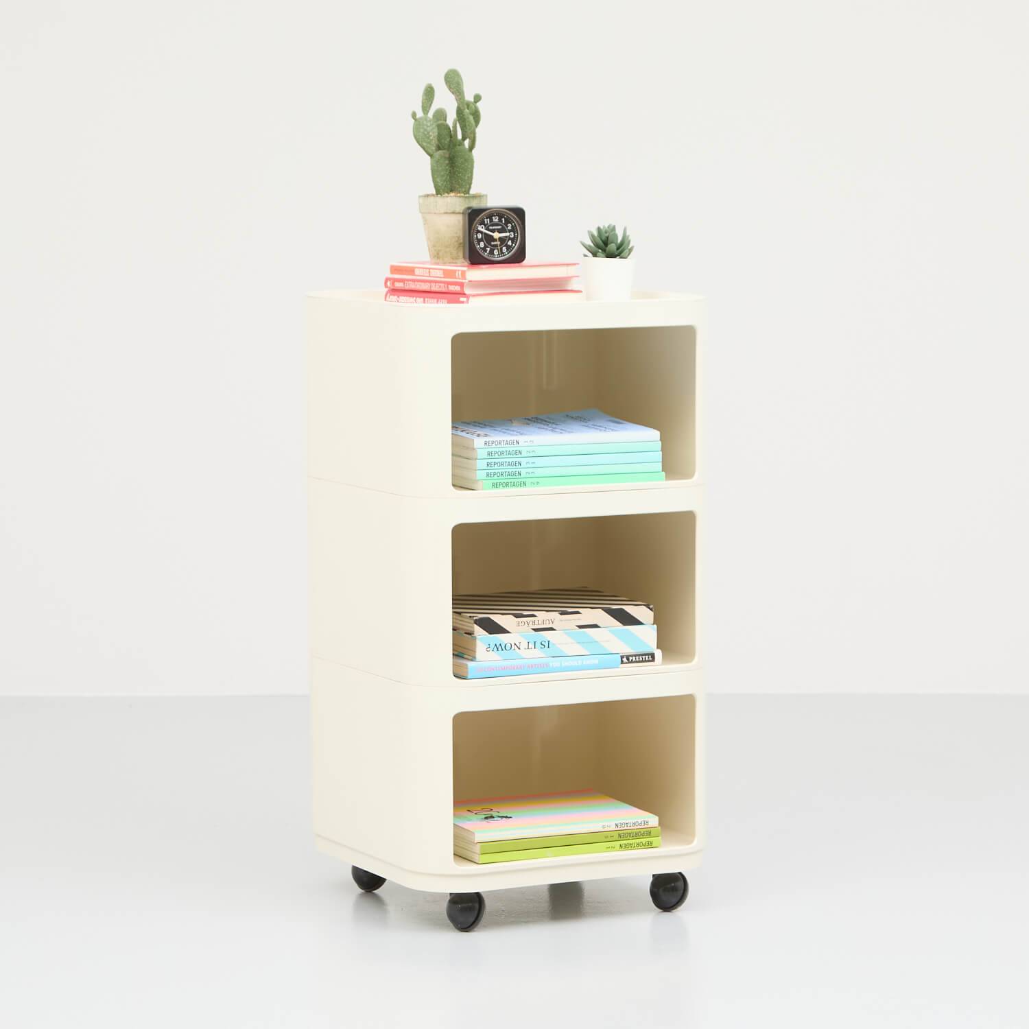 Rollwagen aus den 70er Jahren. Design Anna Gastelli Ferrieri für Kartell. Das Modulare, dreiteilige Aufbewahrungsmöbel besteht au Kunststoff und verfügt über vier Rollen.