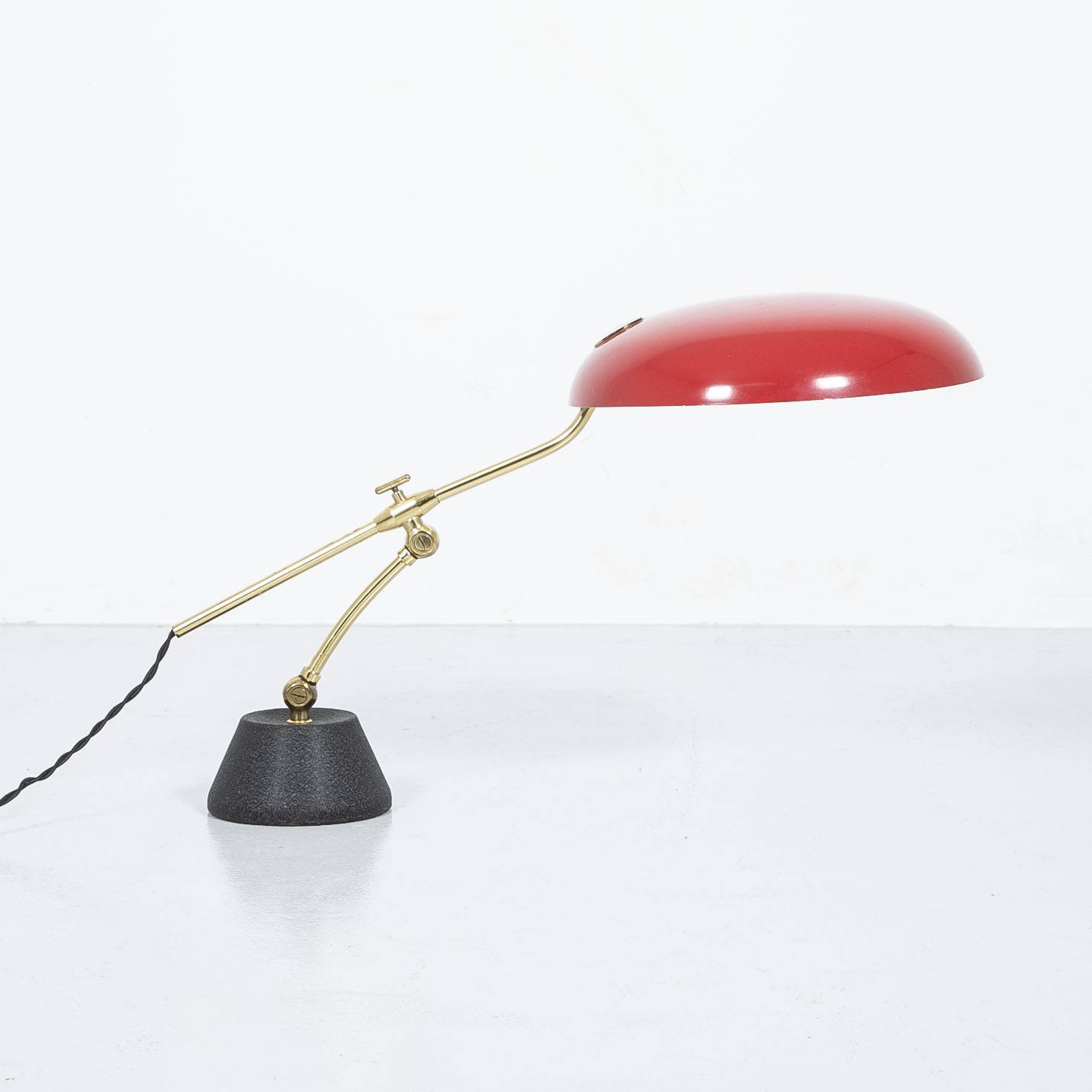 Rote Tischlampe BAG Turgi. Lampenfuss aus Stahl mit schwarzem Schrumpflack, verstellbarer Arm aus Messing, schwenkbarer Lampenschirm aus lackiertem Stahlblech. Guter Zustand.