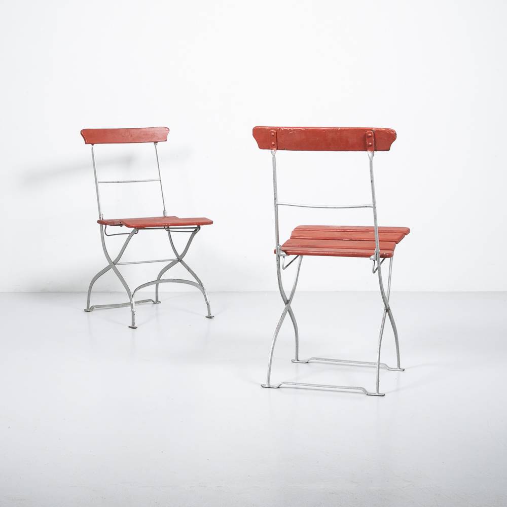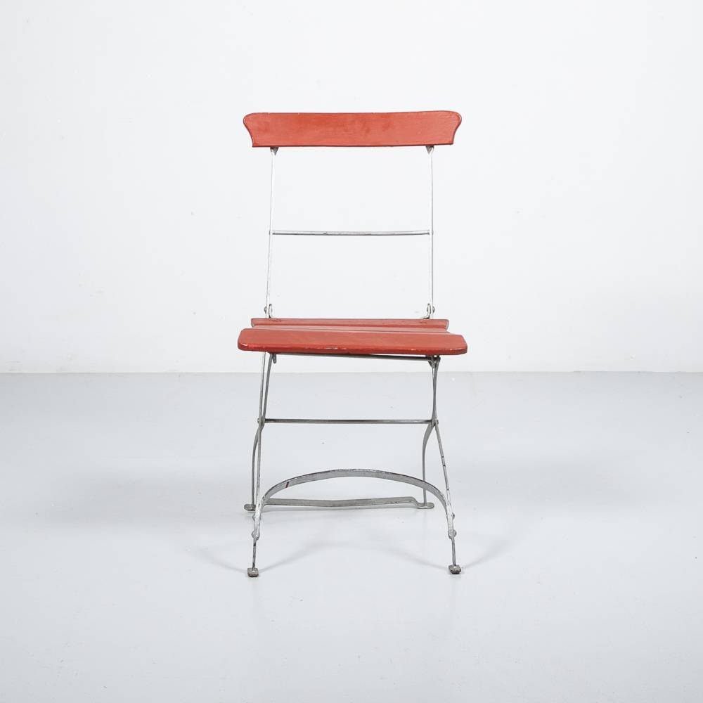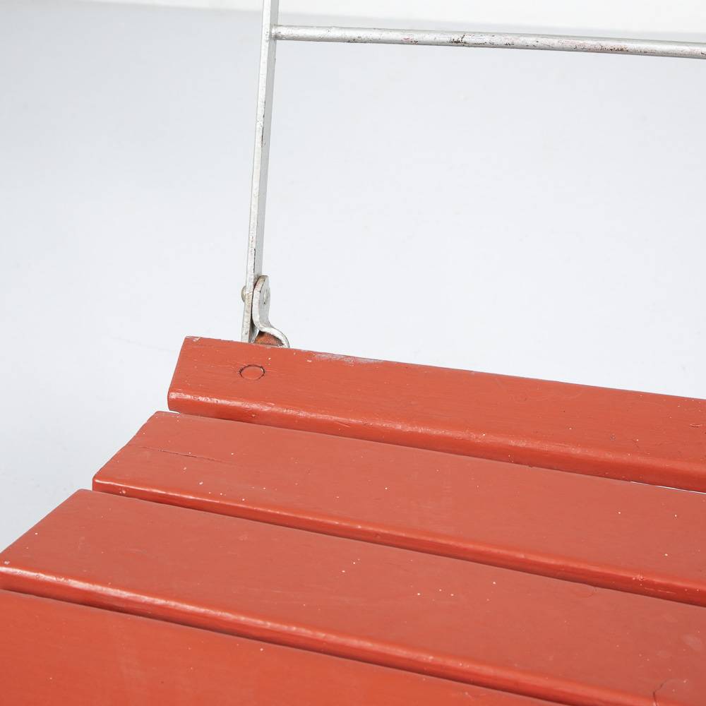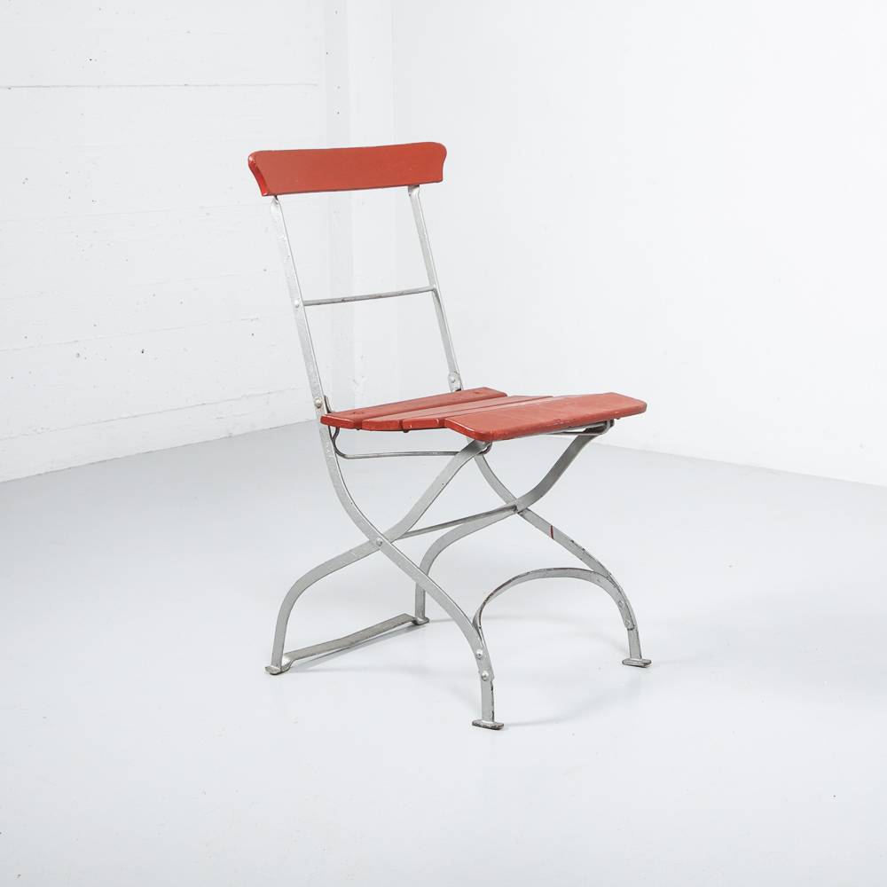 Roter Klappstuhl. Gestell aus silber lackiertem Stahl, rot lackierte Latten aus masisvem Holz. Mit Patina. Preis pro Stück.