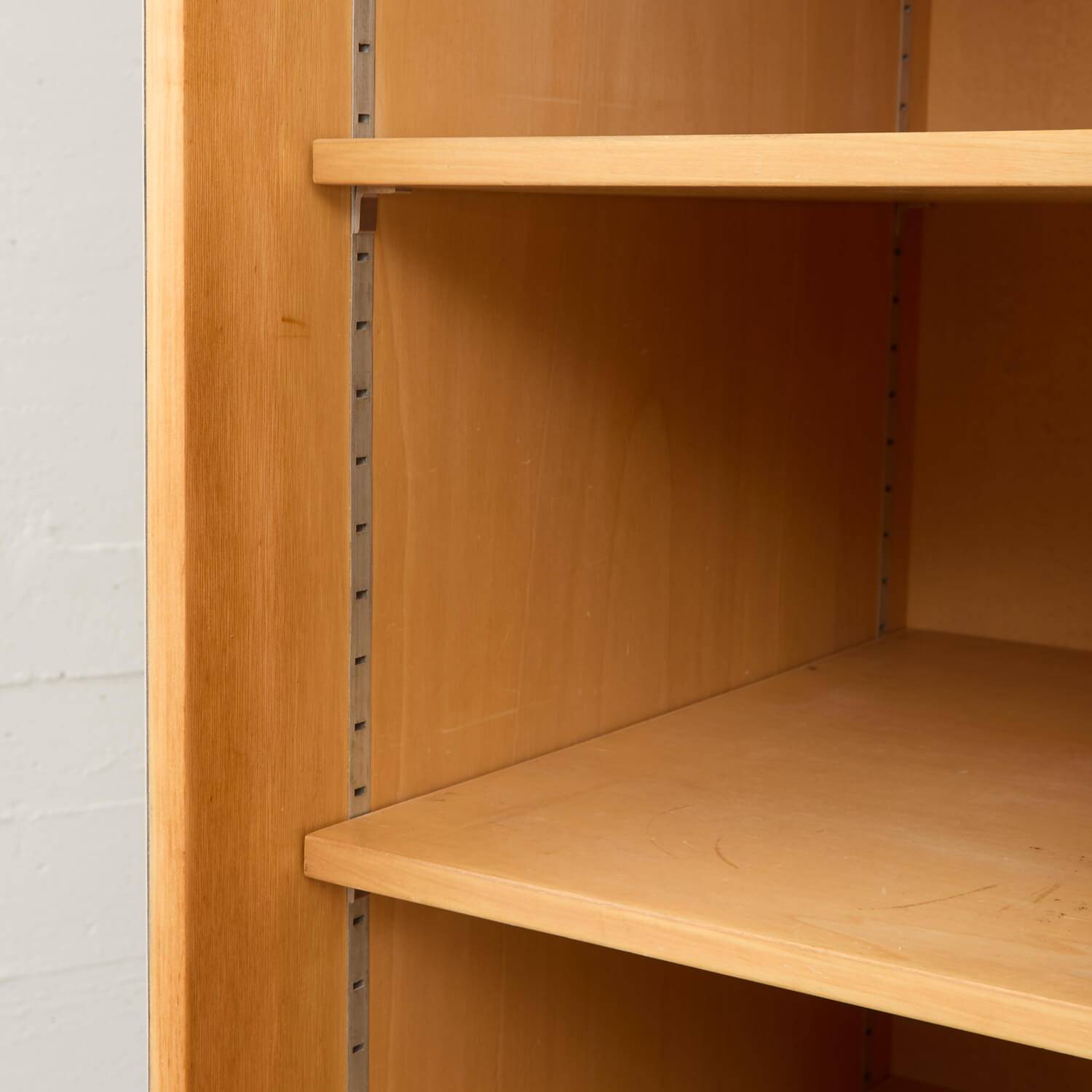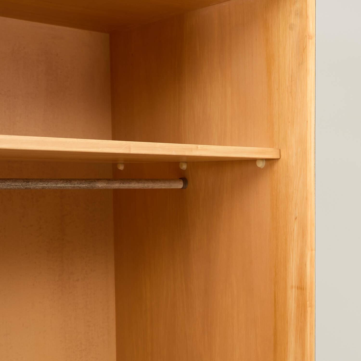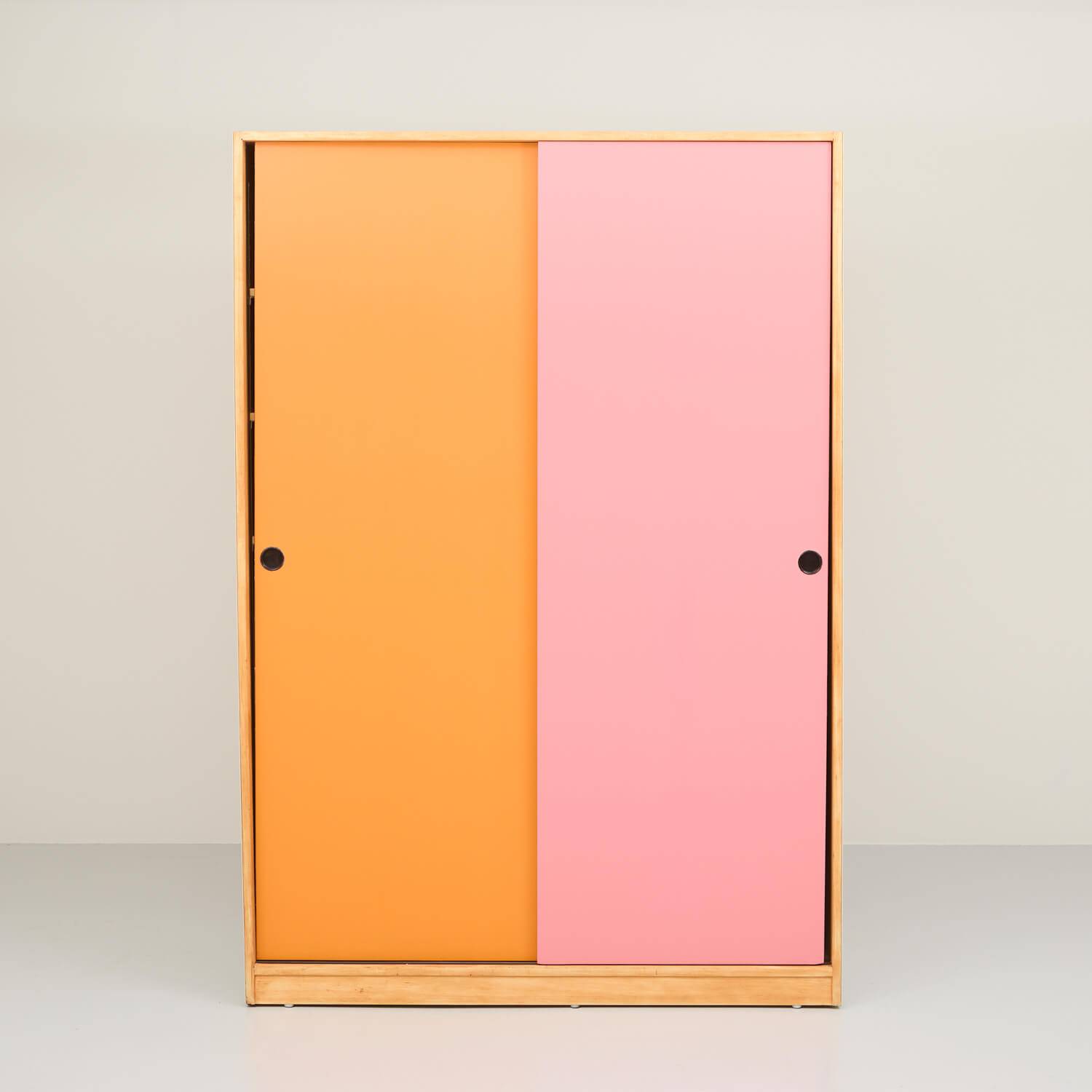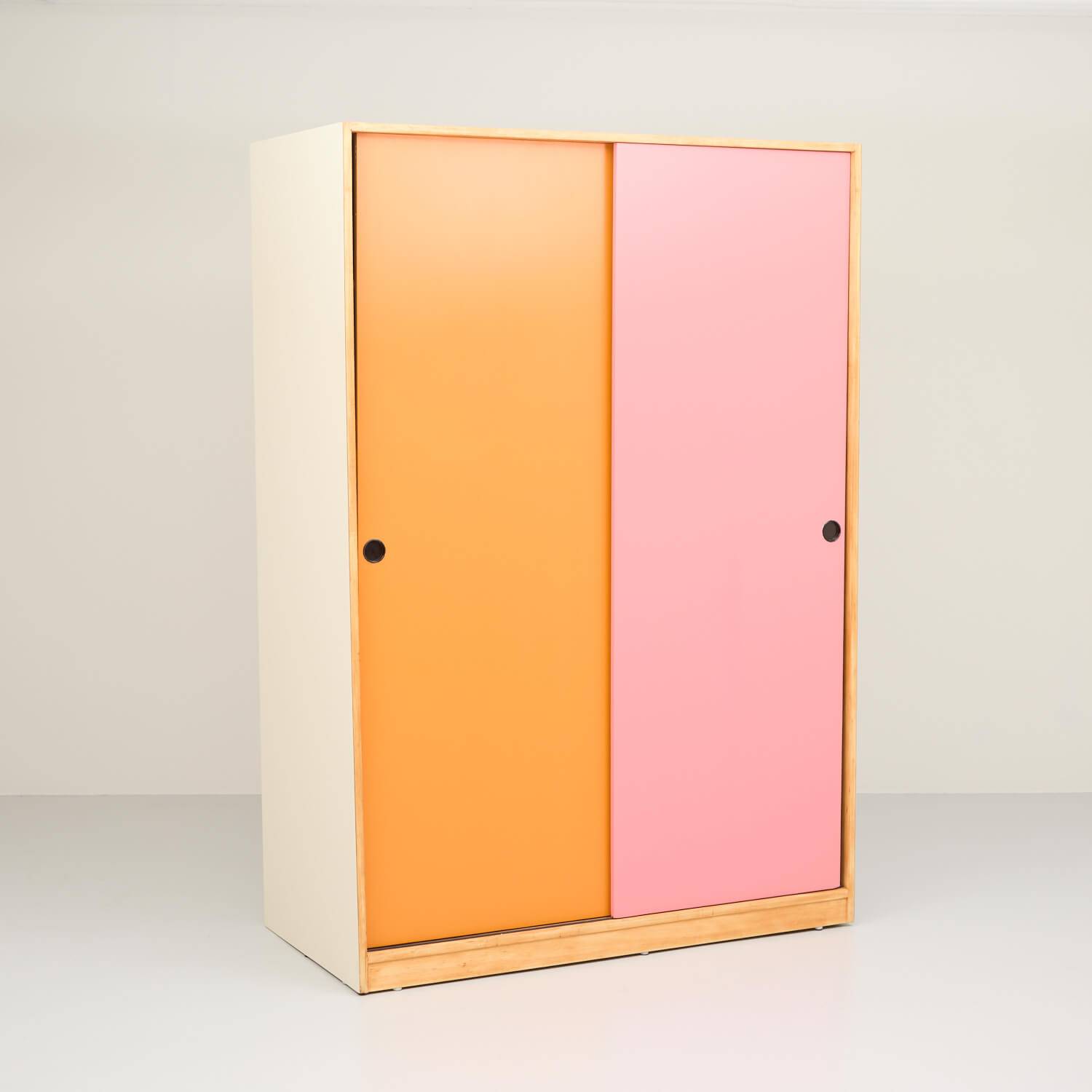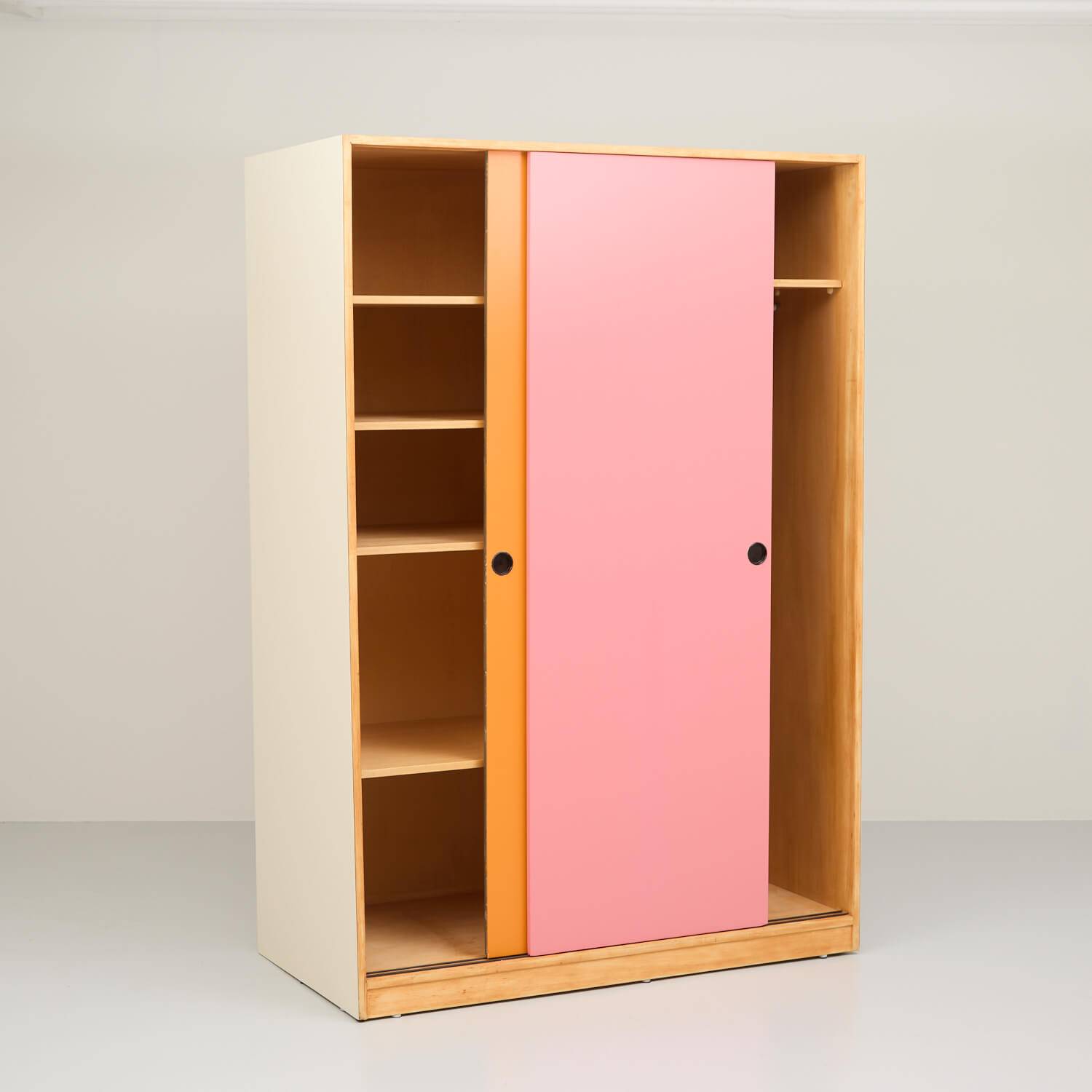 Schiebetürenschrank mit Türen in pink und orange. Seiten mit hellem Linoleum. Korpus aus Holzwerkstoff furniert. Im Inneren linke Seite mit vier Tablaren. Rechte Seite eine Kleiderstange sowie ein Tablar. Die Türen schliessen nicht vollständig an der Längskante, da der Korpus leicht verzogen ist. Ansonsten guter Zustand.