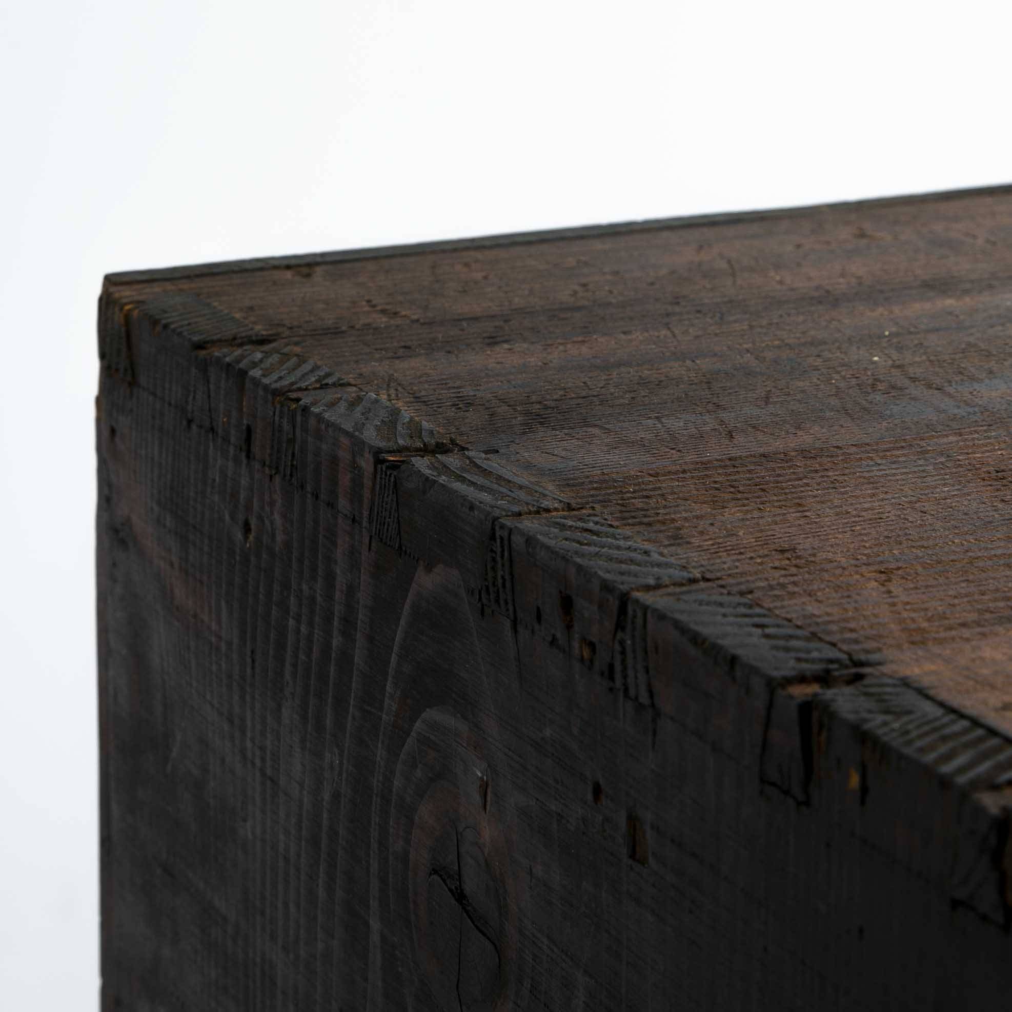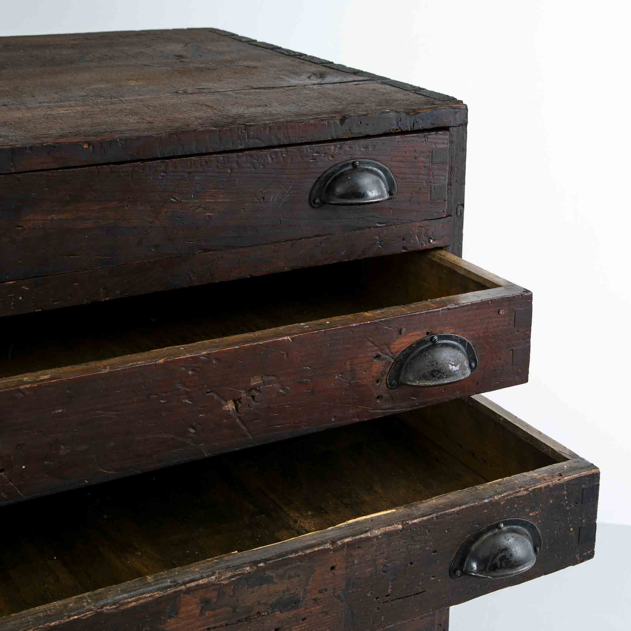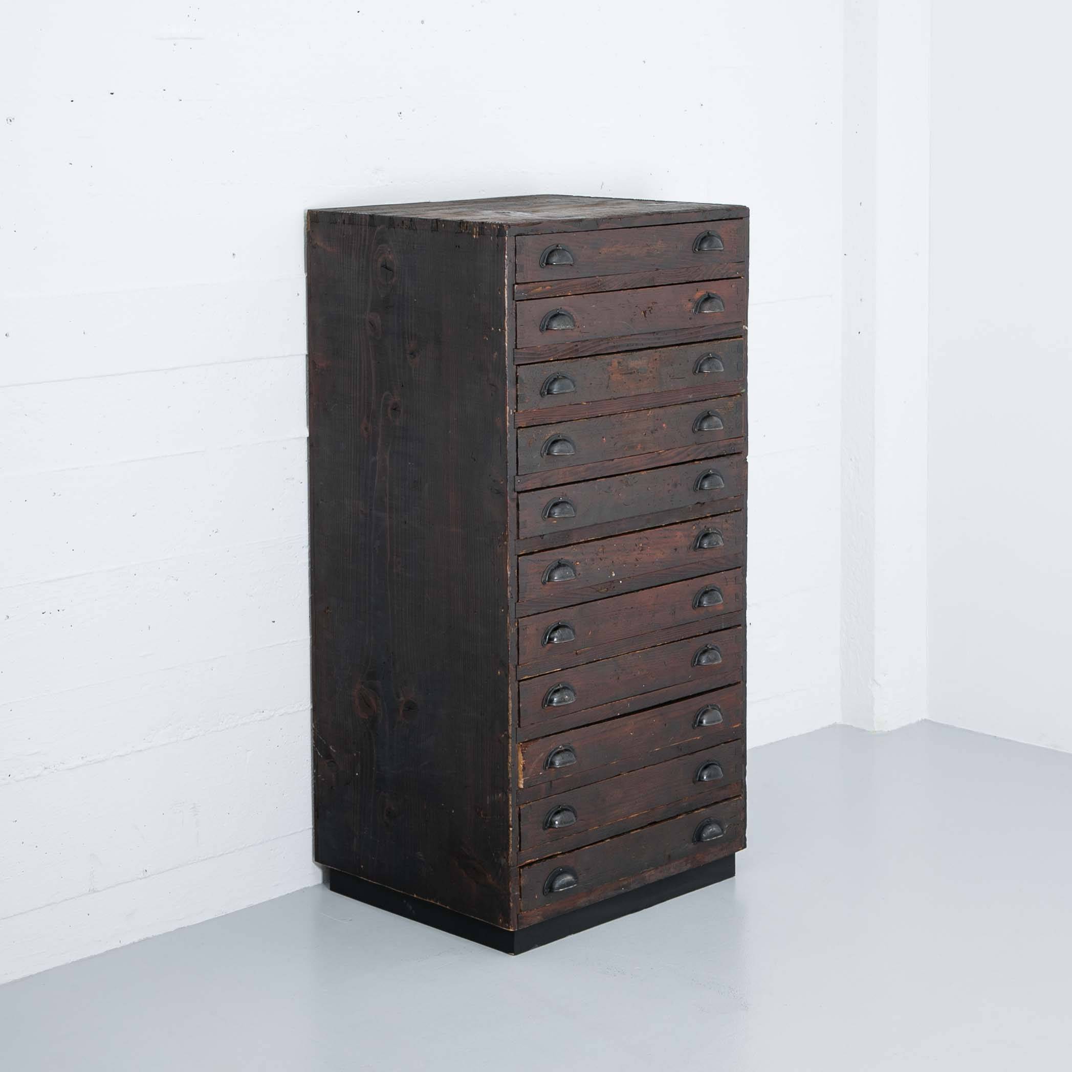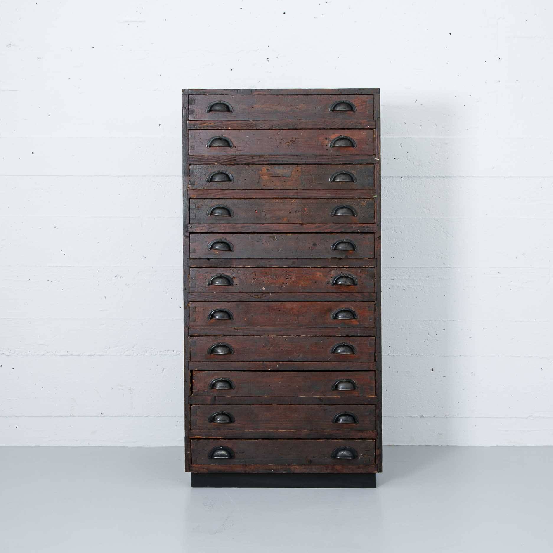 Schmale Kommode mit elf Schubladen. Hergestellt aus massivem, gebeiztem Tannenholz. Schubladen innen aus massivem Buchenholz. Mit Patina. Diese Kommode steht aktuell in der MICASA Filiale Sihlcity und kann dort besichtigt und gekauft werden.
