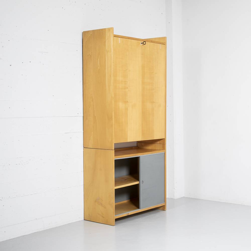 Aufklappbarer Sekretär von Emil Guhl für Wohnhilfe aus den 1950er Jahren. Abschliessbarer Korpus mit Furnier in Birke, Tischplatte aus grauem Kunstharz, Schiebetüren aus Pavatex. Innen zwei höhenverstellbare Tablare. Mit leichten Furnierschäden am Holz.