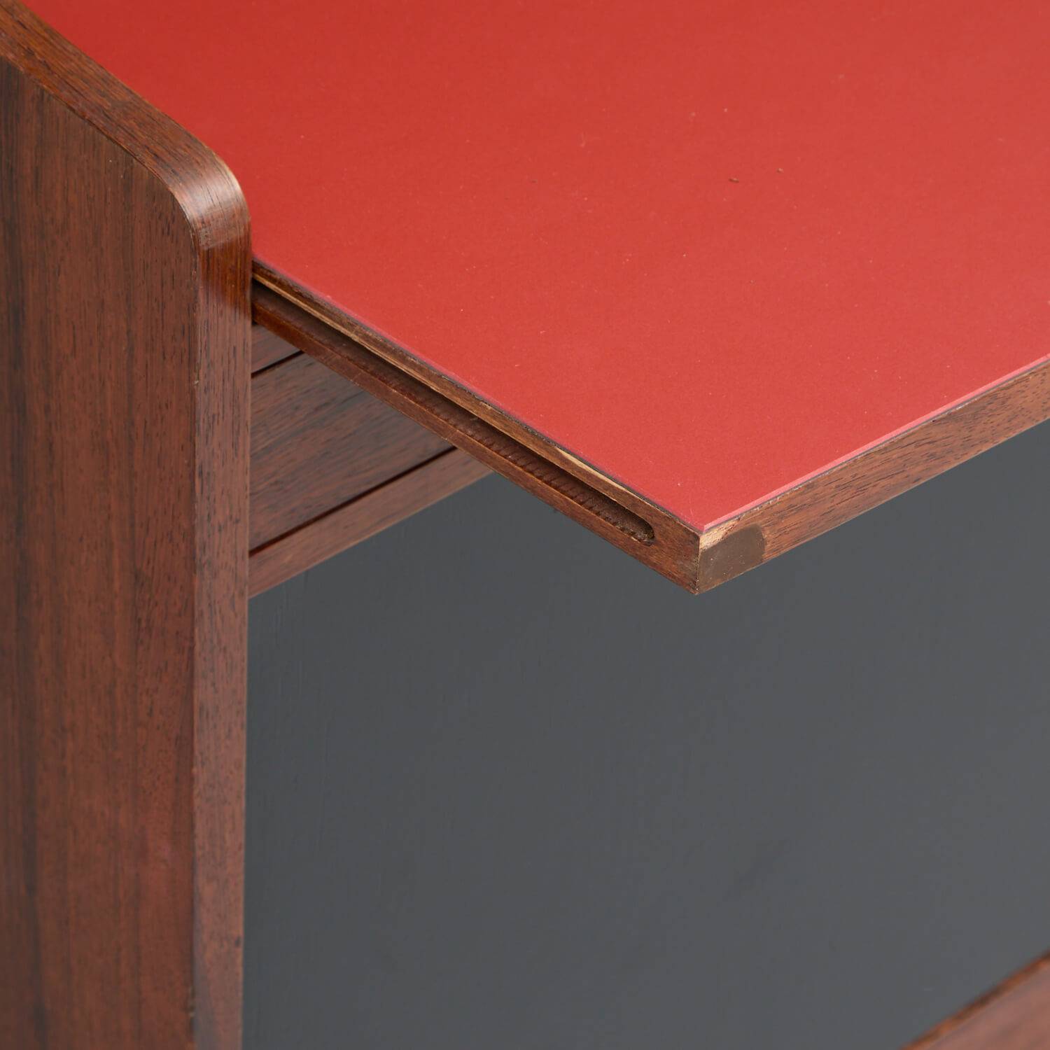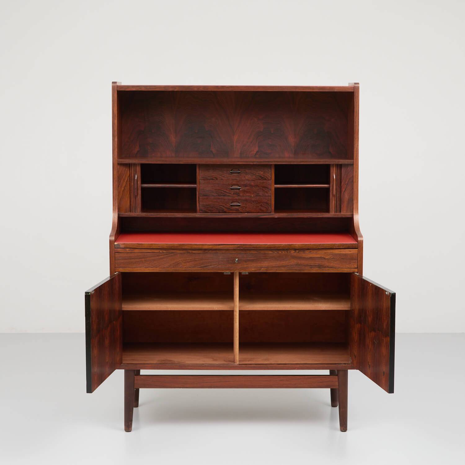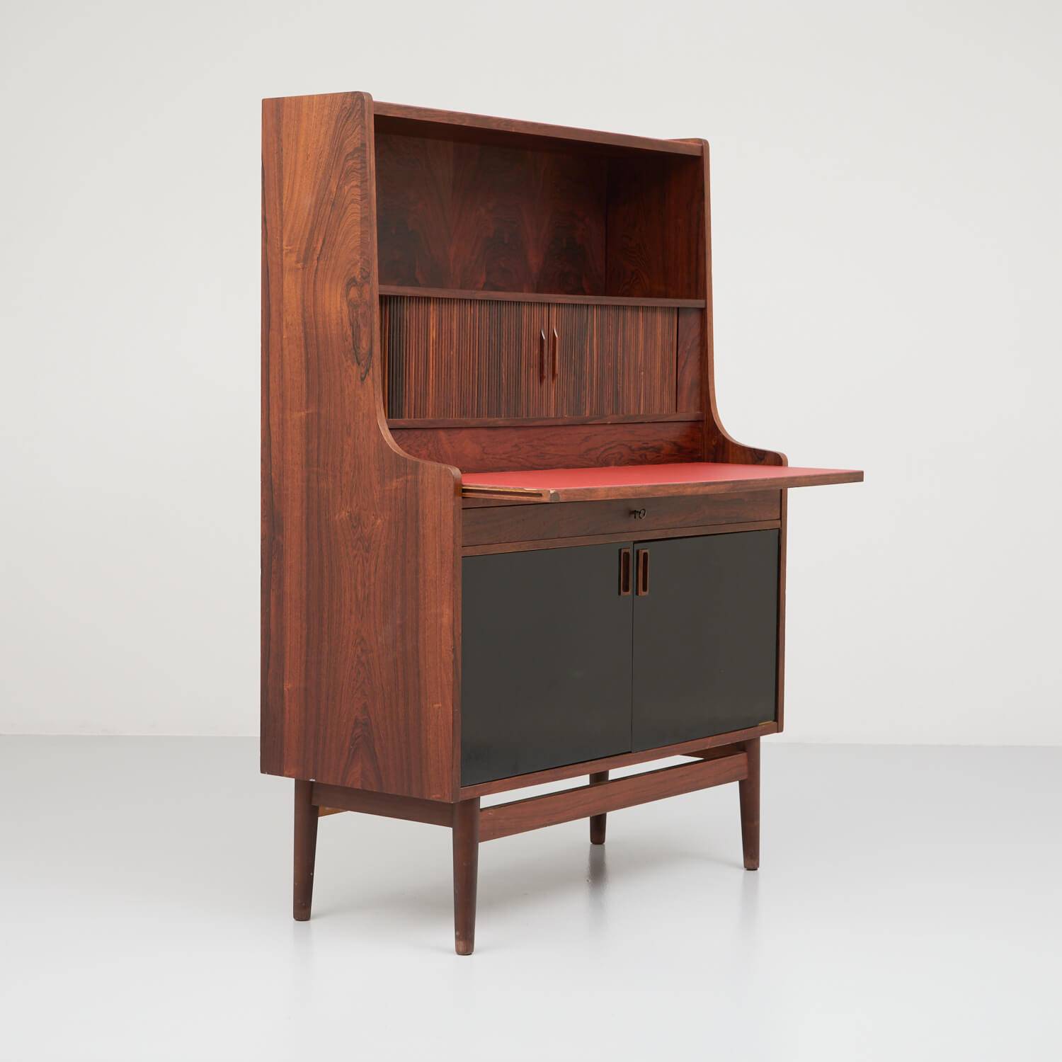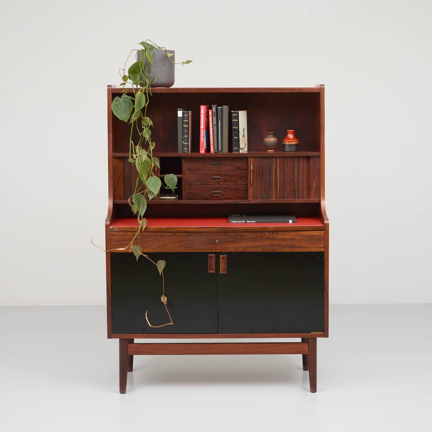 Palisander Sekretär von Johannes Sorth für Bornholm Møbelfabrik aus den 60er Jahren. Korpus mit Furnier in Palisander, Türblätter schwarz lackiert. Zwei höhenverstellbare Tablare unten, eine breite Schublade , ein Auszugstisch, oben zwei schmale Lateraltüren mit drei Schubladen und einem Spiegelauszug. Deckblatt und Auszug in unserer Werkstatt mit Linoleum neu bezogen.Sehr guter Zustand.