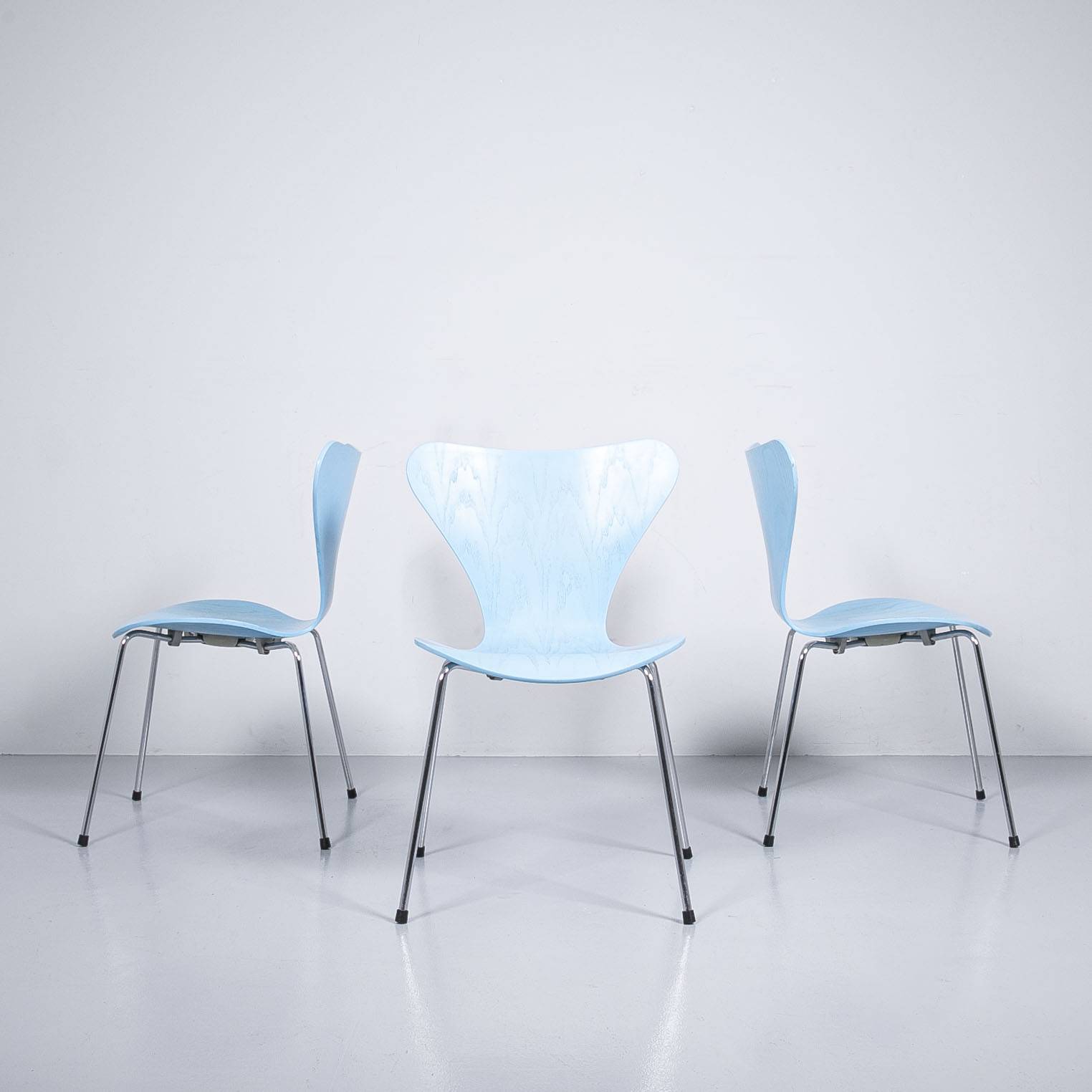 Stapelstuhl Serie 7 Azur, hergestellt von Fritz Hansen, nach einem Entwurf von Arne Jacobsen. Gestell aus verchromtem Stahl, Sitzschale aus lackiertem Formsperrholz. Mit Gebrauchsspuren. Preis pro Stück.