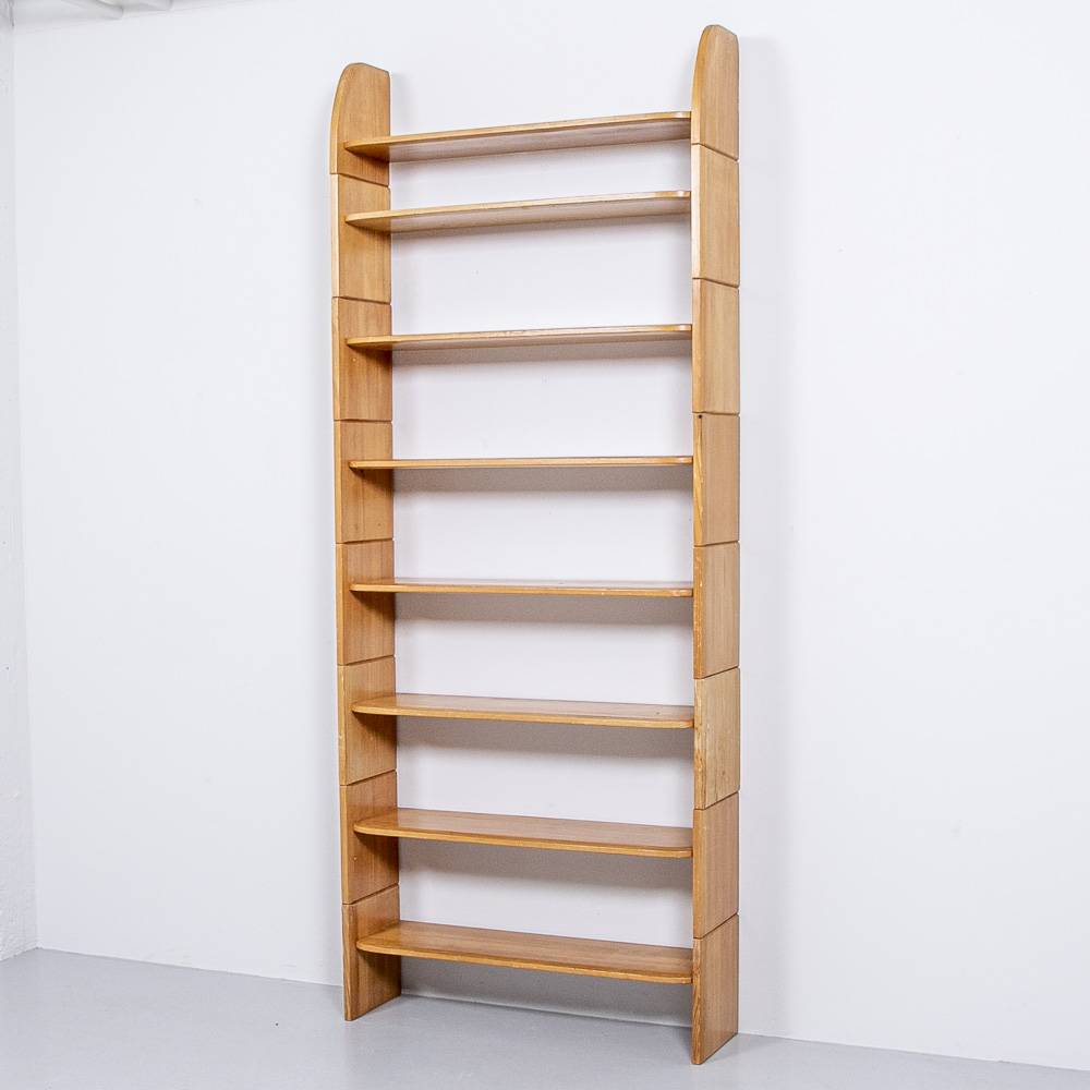 “Modulares Stegregal von Arthur Milani und Hans Wallis, gebaut von der Werkgenossenschaft “”Wohnhilfe”” aus massiver Fichte, lackiert. Entwickelt in den 1940er Jahren. Altersbedingte Gebrauchsspuren. 7 Regalmodule und ein Abschlussmodul. Das Regal lässt sich ganz einfach in einzelne Module zerlegen.