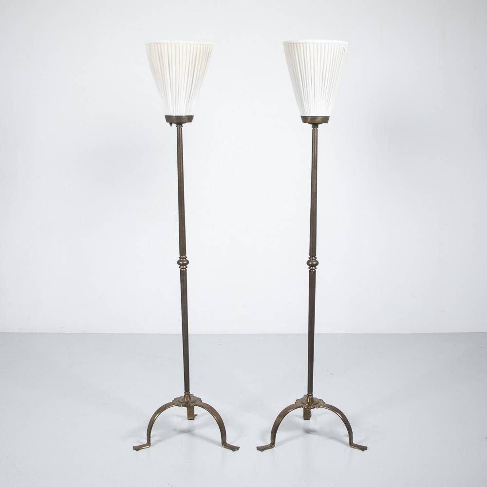 Stehlampe mit Messingfuss. Gestell aus Messing mit Dreifuss, Lampenschirm aus weissem Stoff. Mit Gebrauchsspuren am Lampenschirm. Preis pro Stück.