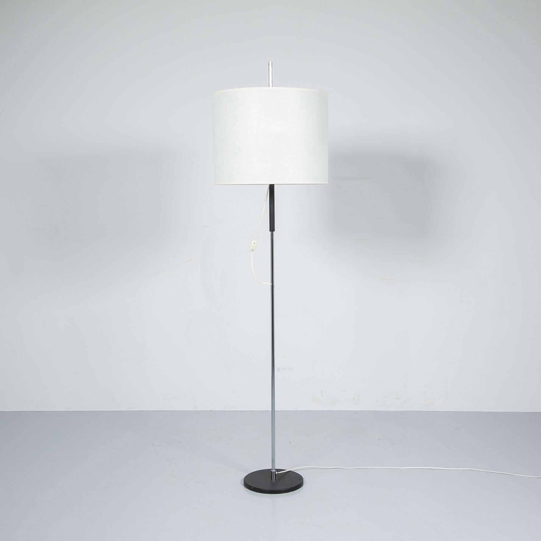 Stehlampe mit Papierschirm. Fuss aus schwarz lackiertem Stahl, Stab aus verchromtem Stahl, Lampenschirm mit Papier bezogen. Höhenverstellbarer Lampenschirm. Guter Zustand.
