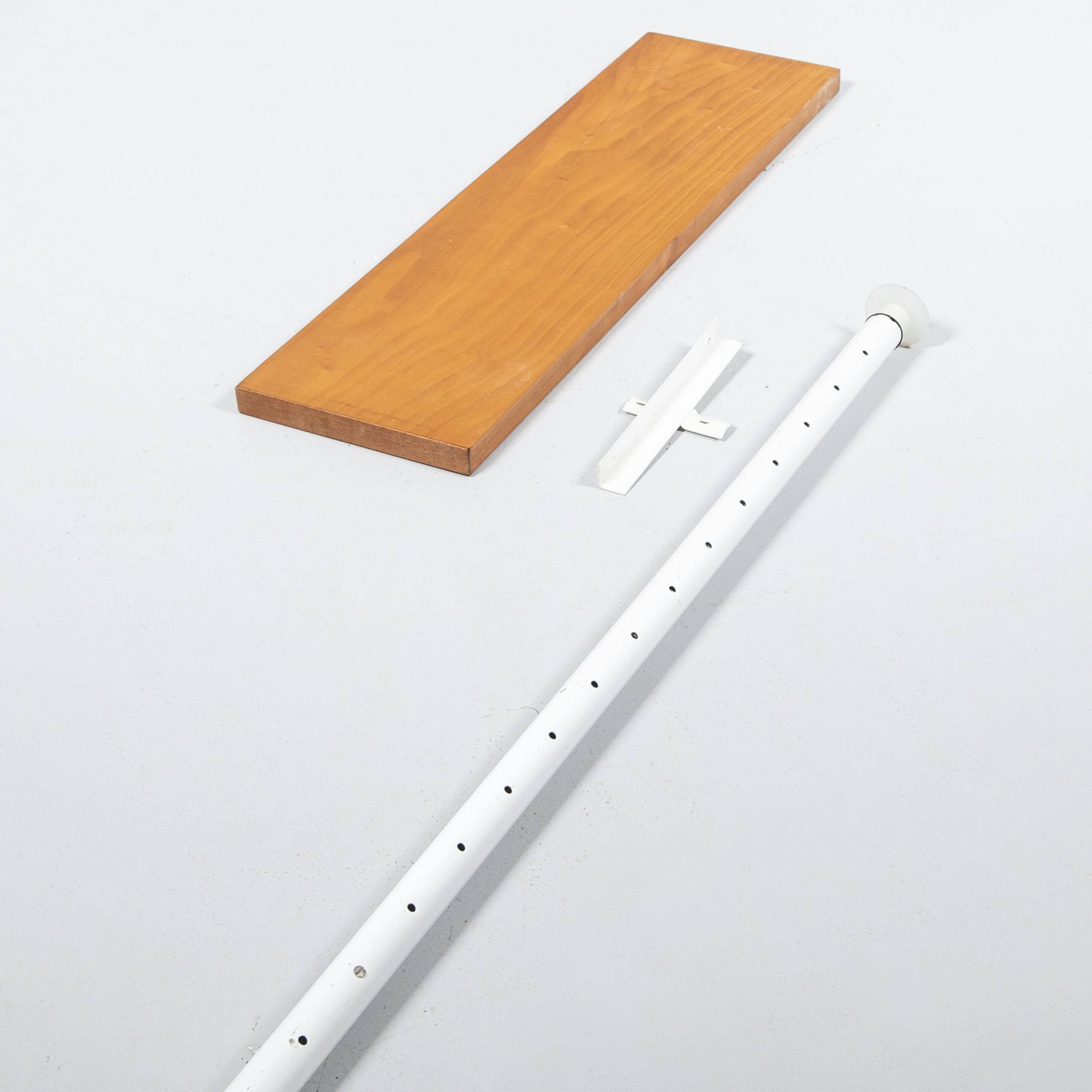 Teleskopregal 028 Nussbaum, Höhe 224 – 238 cm (020005). Zwei weiss lackierte Stangen, fünf Tablare 66.5 x 19 x 1.7 cm. Mit Gebrauchsspuren.