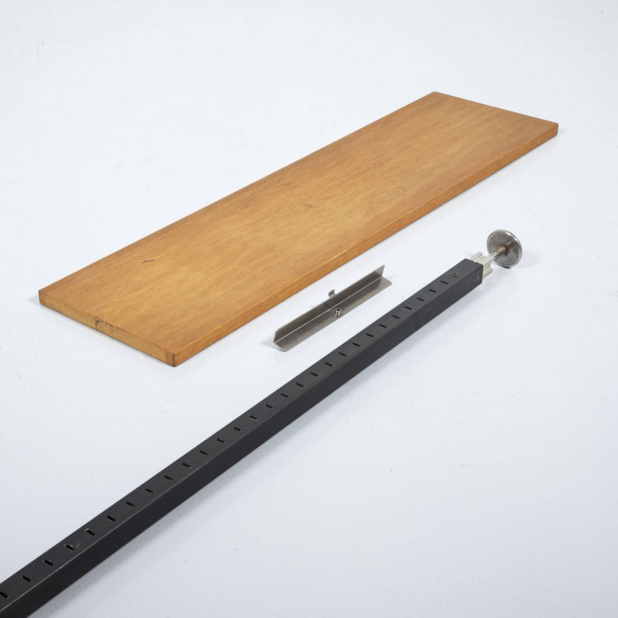 Teleskopregal 056 Tropenholz (020006) Höhe 235- 281 cm. Zwei schwarze Stahlstangen, sechs Tablare 88.5 x 24 x 2.4 cm, hergestellt aus Holzwerkstoff mit Furnier in Tropenholz. Mit Gebrauchsspuren.