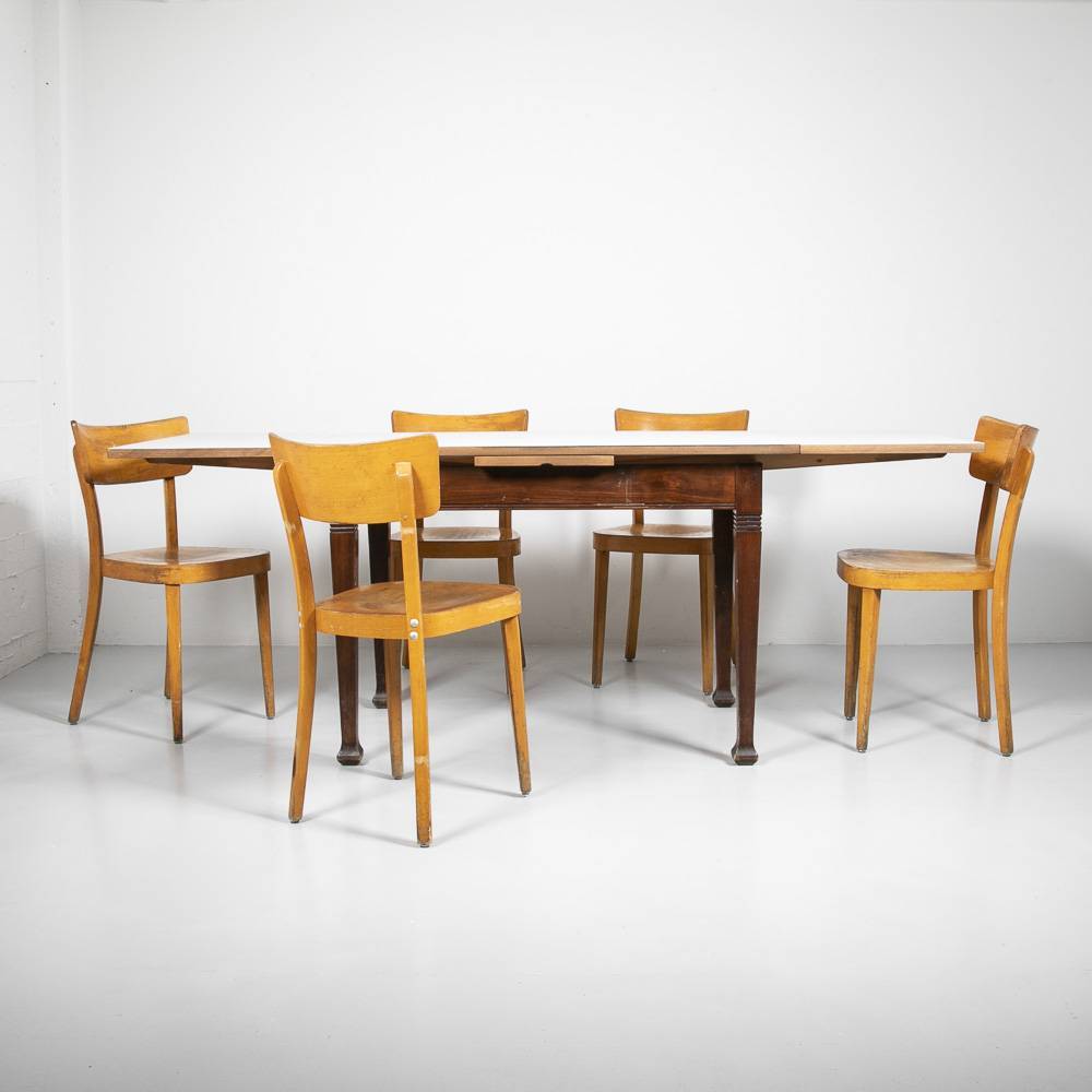 Tisch mit hellgrauem Linobelag und zwei Auszügen. Gestell aus massiver, gebeizter Buche mit Patina. Mit beiden Auszügen misst der Tisch eine Länge von 205 cm.