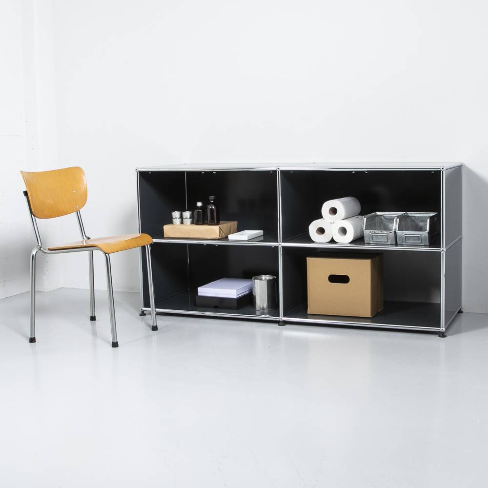 USM Haller Regal oder offenes Sideboard aus pulverbeschichtetem Stahlblech und Chromstahl. Vier Fächer, drei davon mit Rückwand. Oberfläche mit leichten Gebrauchsspuren.