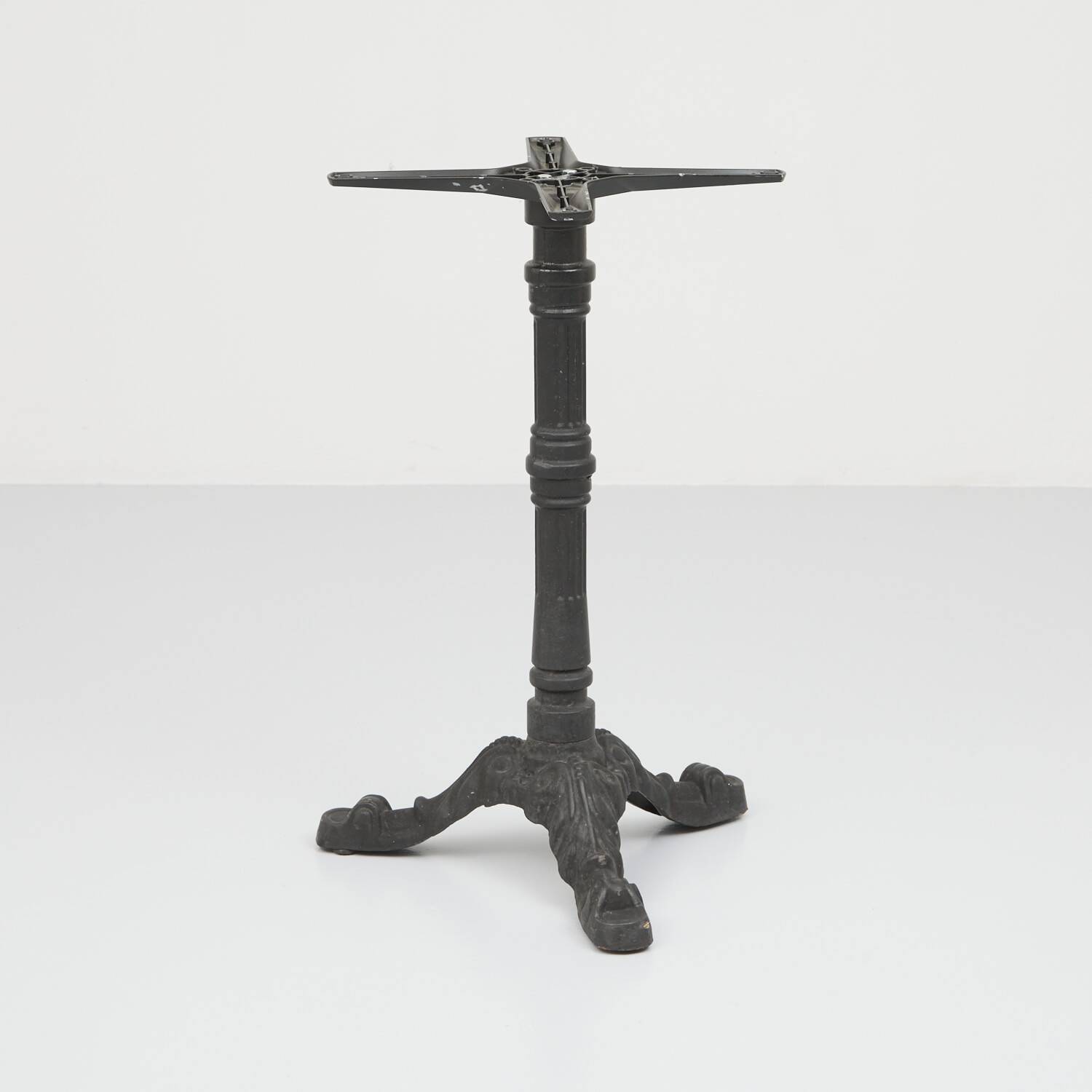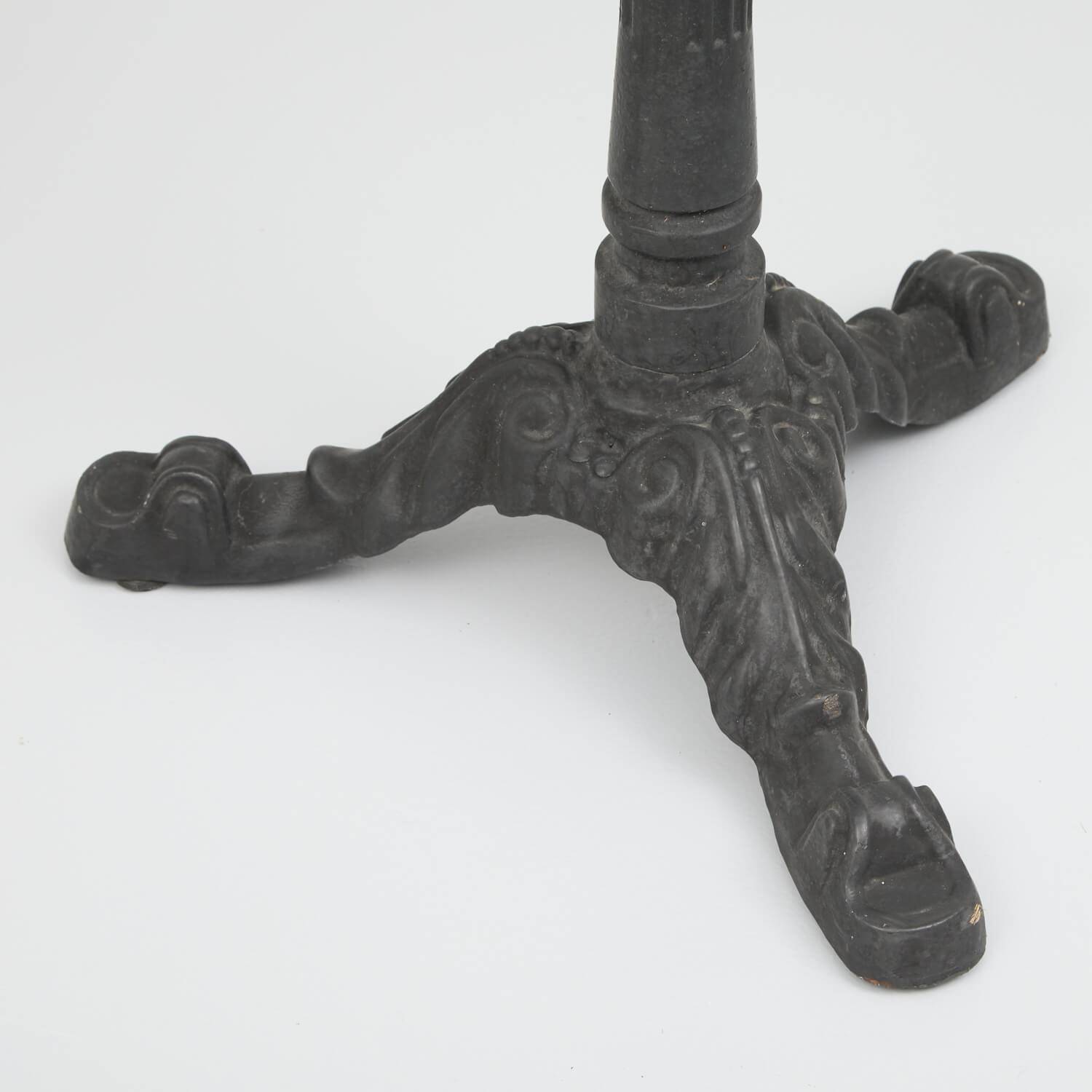 Verzierter Gusseisenfuss passend zu einer kleinen quadratischen oder runden Tischplatte. Mit Patina.