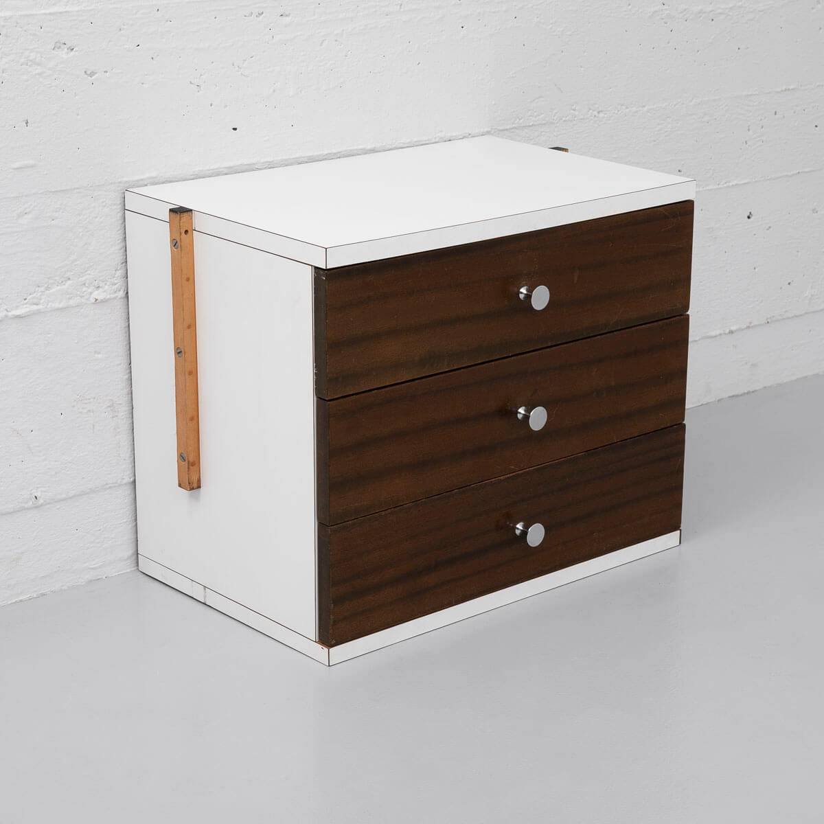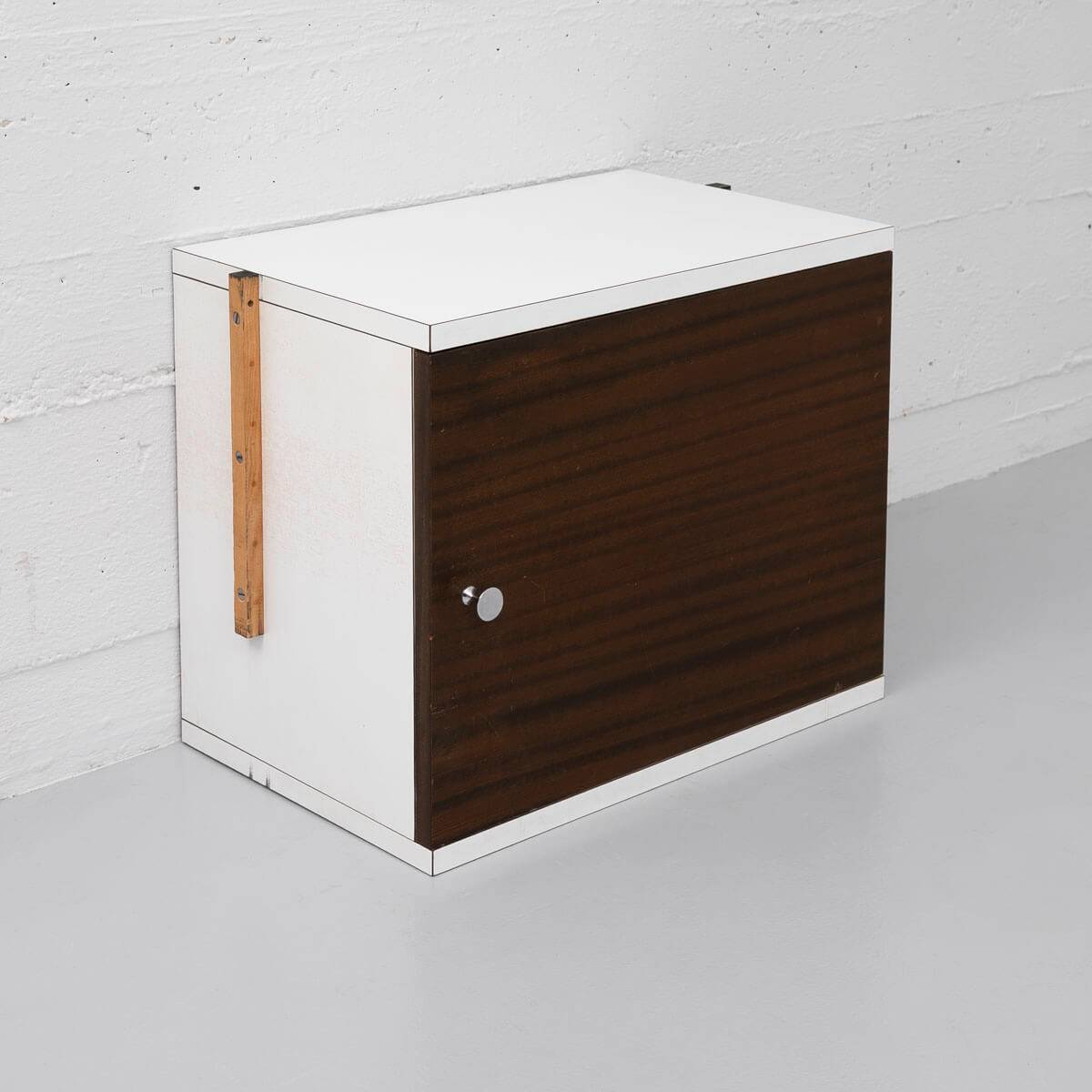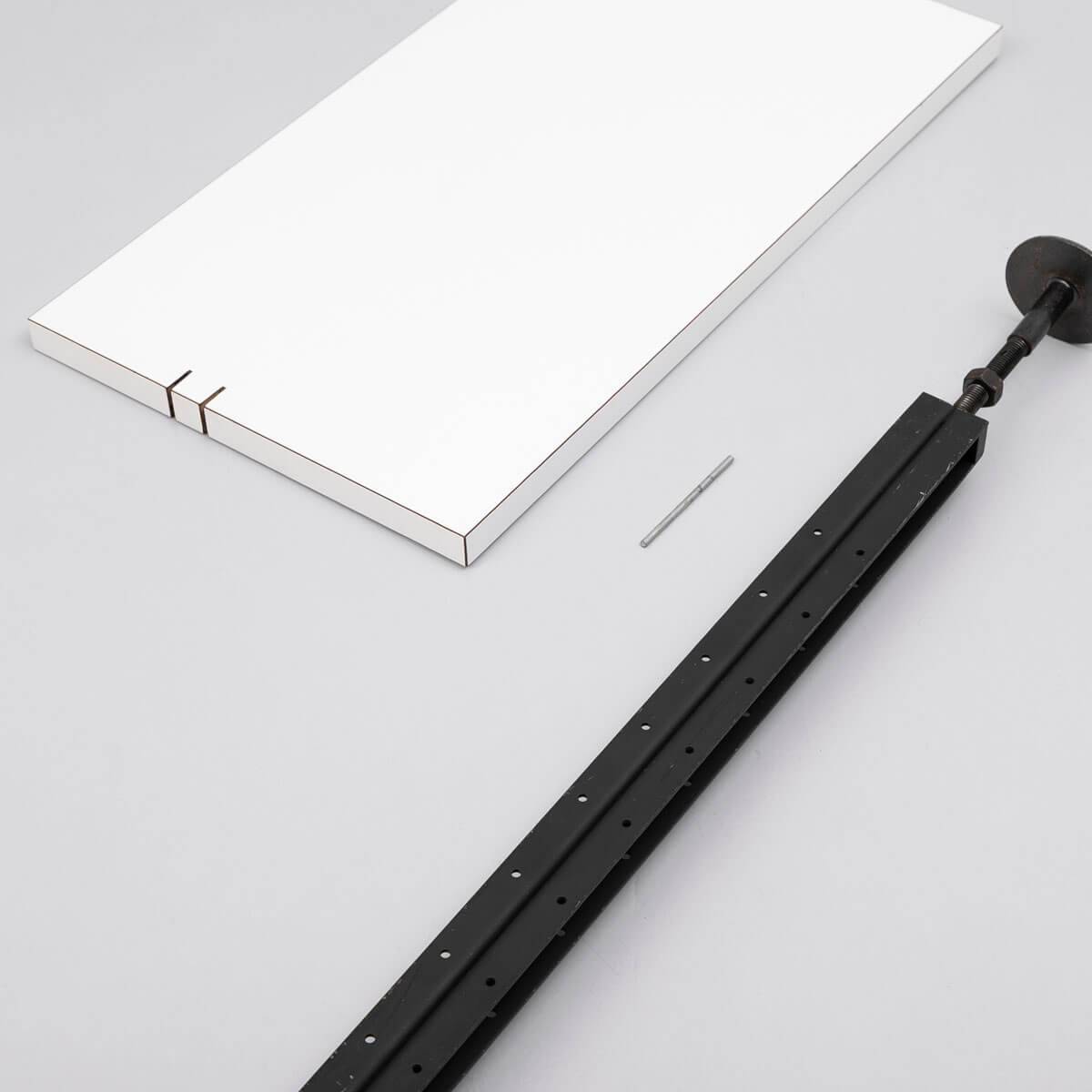 Victoria Teleskopregal Höhe 236 bis 240.5 cm Set 3. Zwei schwarze Stangen, Tablare und Korpuse aus Holzwerkstoff belegt mit weissem Kunstharz, Fronten furniert. Zwei schwarze Stangen, Drei Tablare 55.4 x 23 x 1.9 m, ein Tablar 55 x 30 x 1.9 cm, ein Korpus 52 x 34 x 43 cm mit drei Schubladen, ein Korpus 52 x 34 x 43 cm mit einer Tür und einem Tablar höhenverstellbar. Mit Gebrauchsspuren.