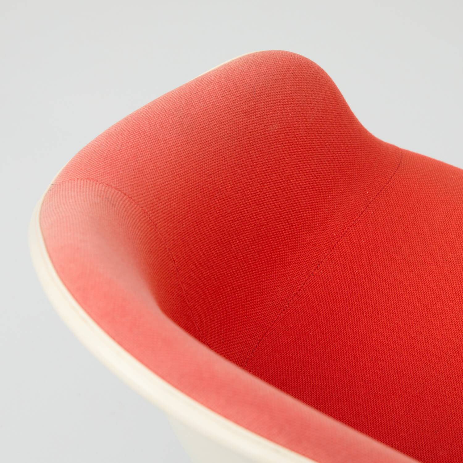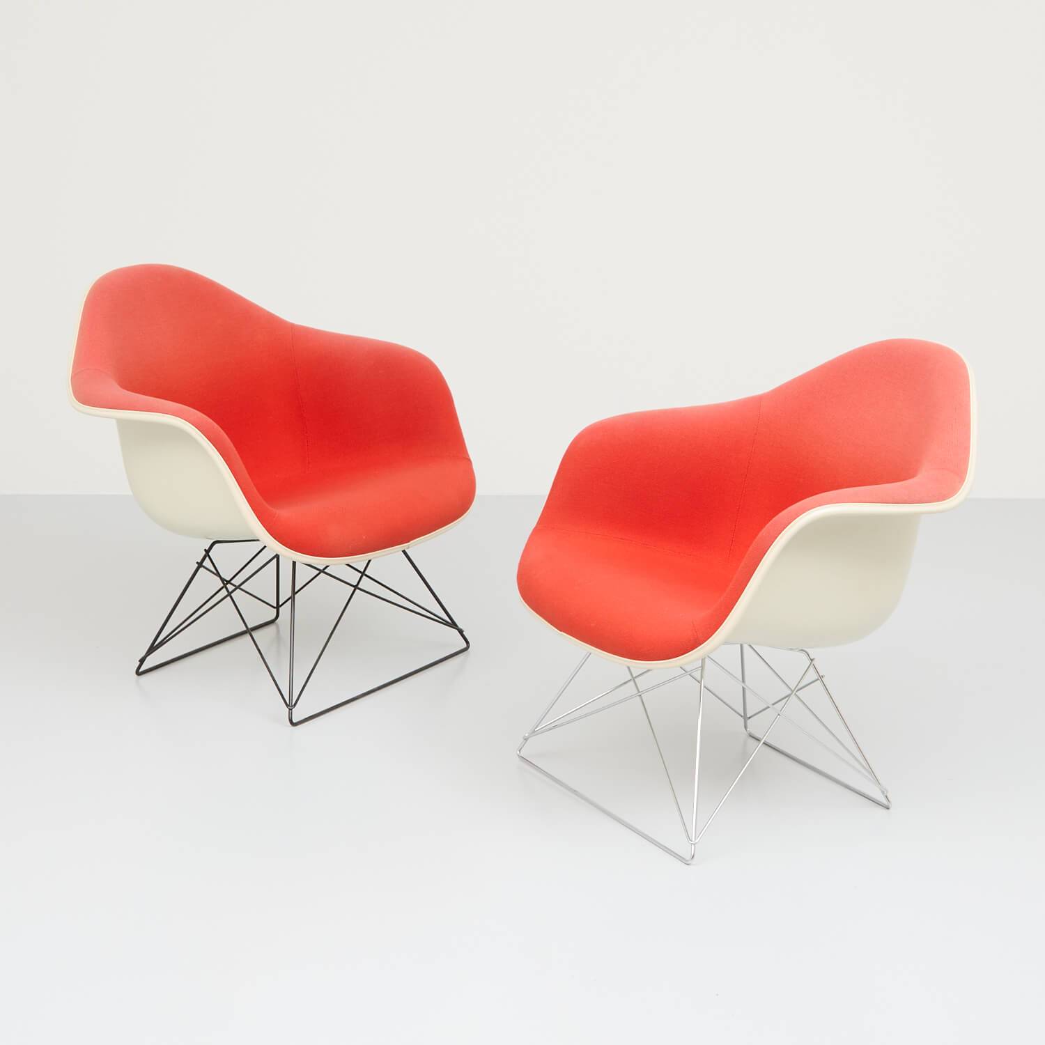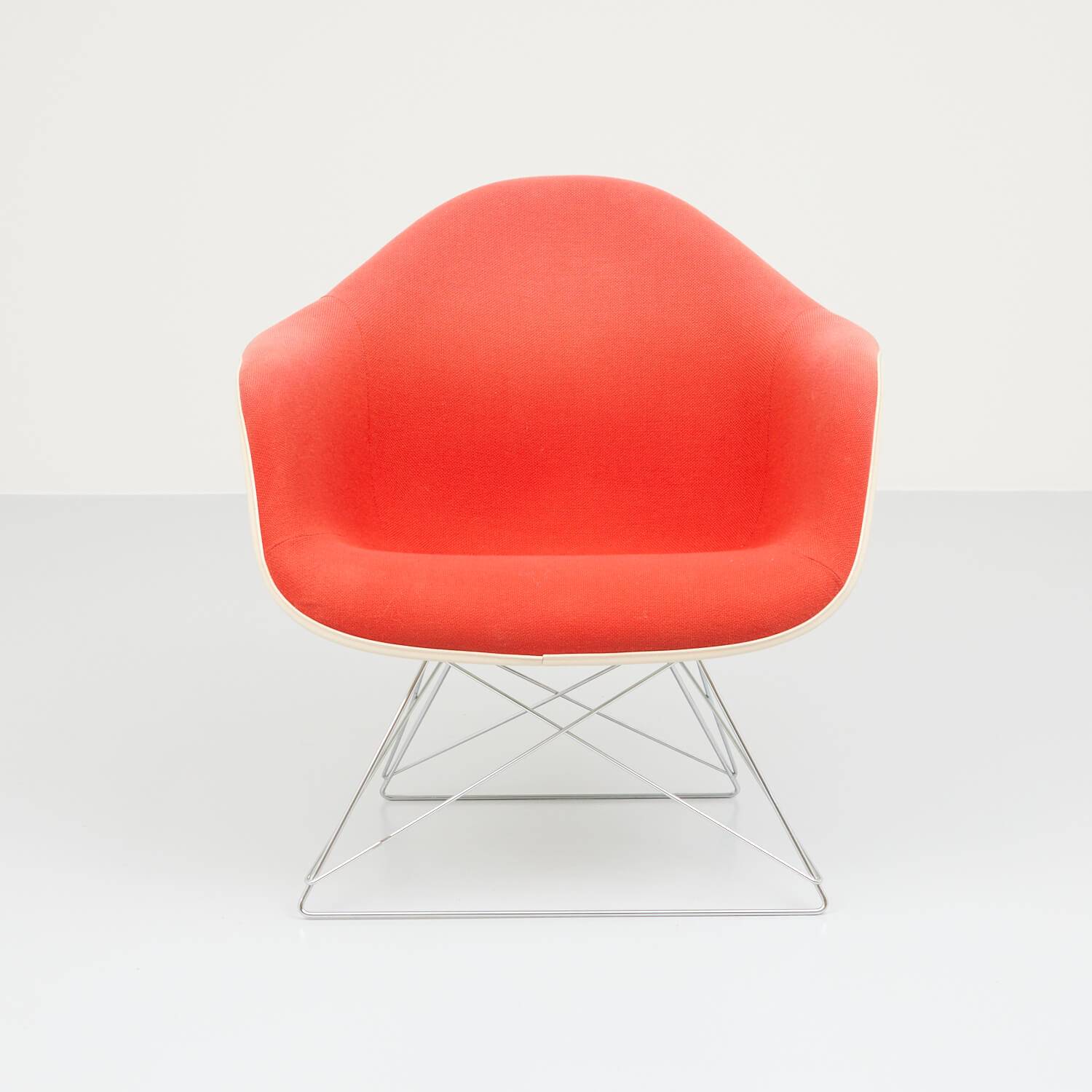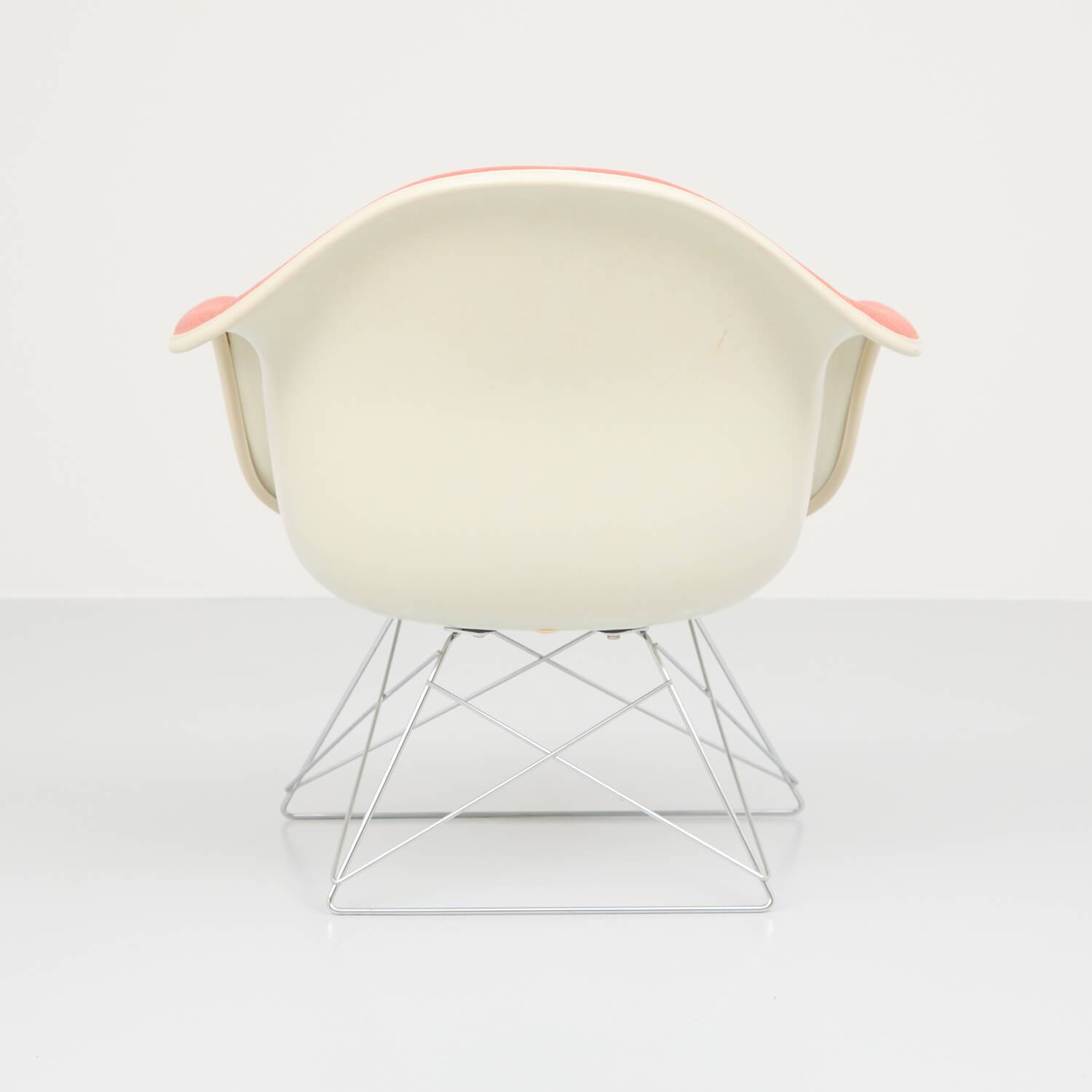 Vitra Charles & Ray Eames Armchair. Orange gepolstert, hier auf einem chromfarbenen und einem schwarzen Cads Cradle Fuss. Dieser kann jedoch beliebig gegen andere Beine von Eames ausgetauscht werden. Das Polster ist gegen den äusseren Rand hin leicht ausgebleicht. Ansonsten guter Zustand.
