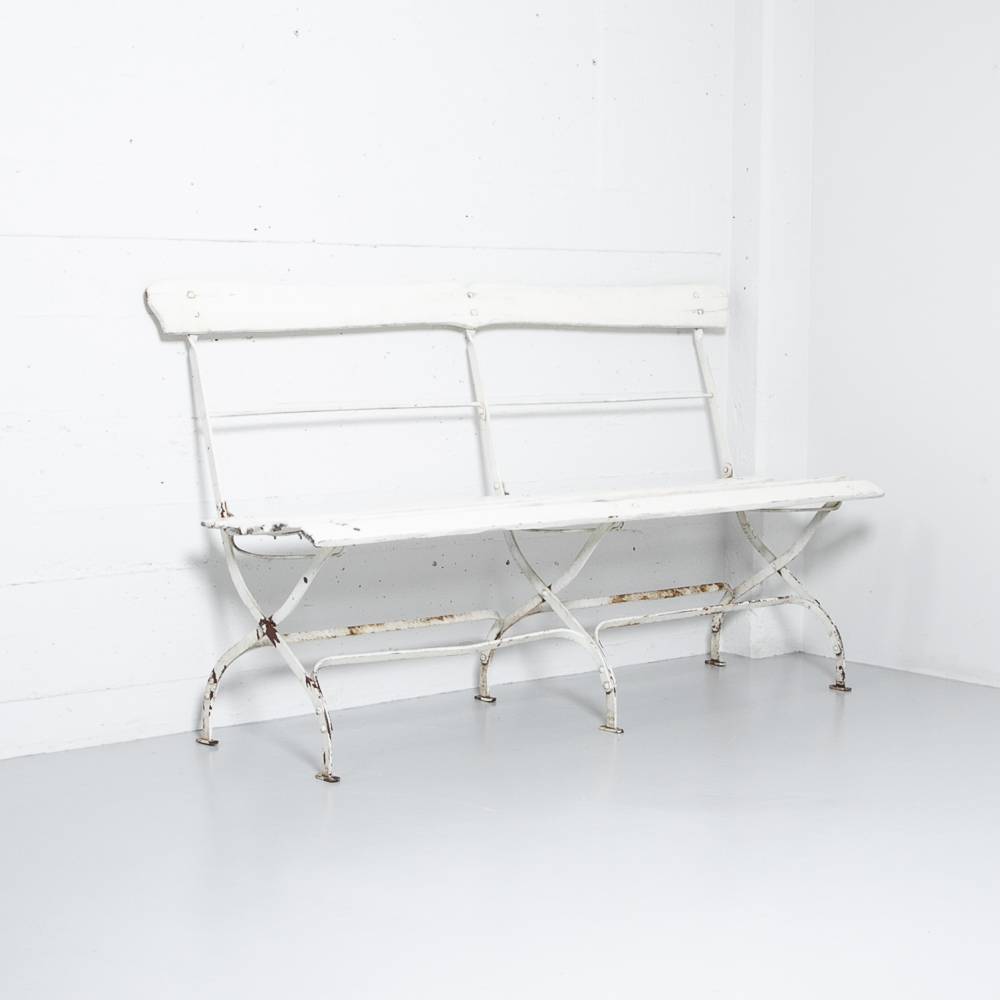 Klappbare Jugendstil Gartenbank aus weiss lackierten Holzlatten und weiss lackiertem Metallgestell. 1 Latte ist am Rand gebrochen. Deutliche Patina am Gestell.