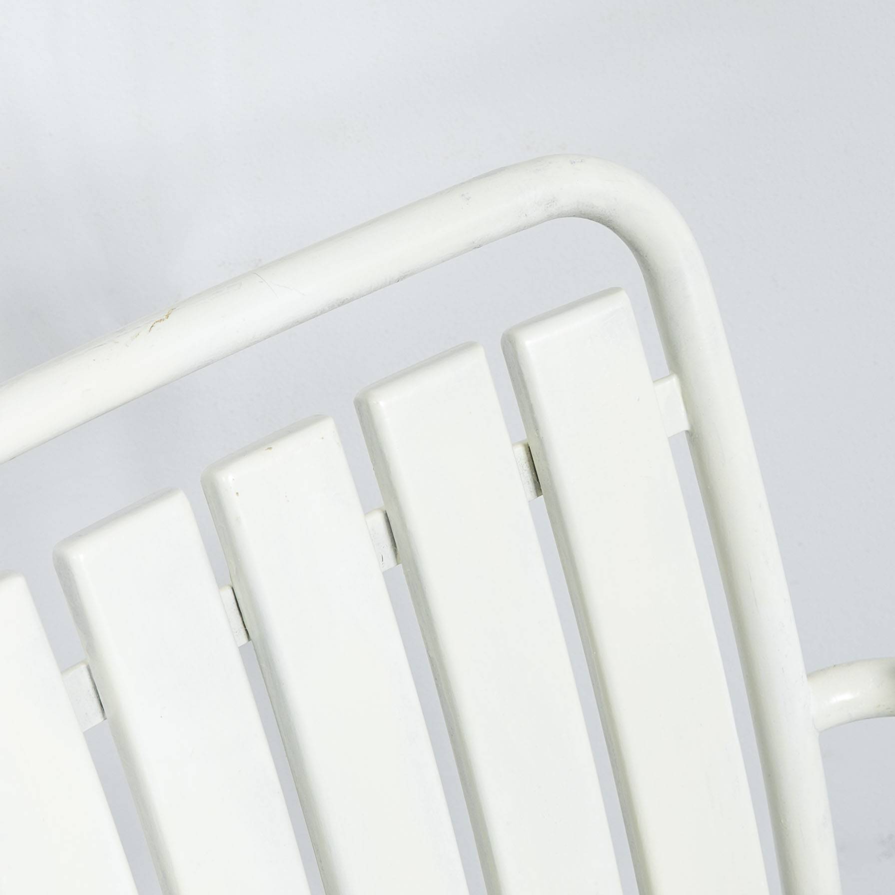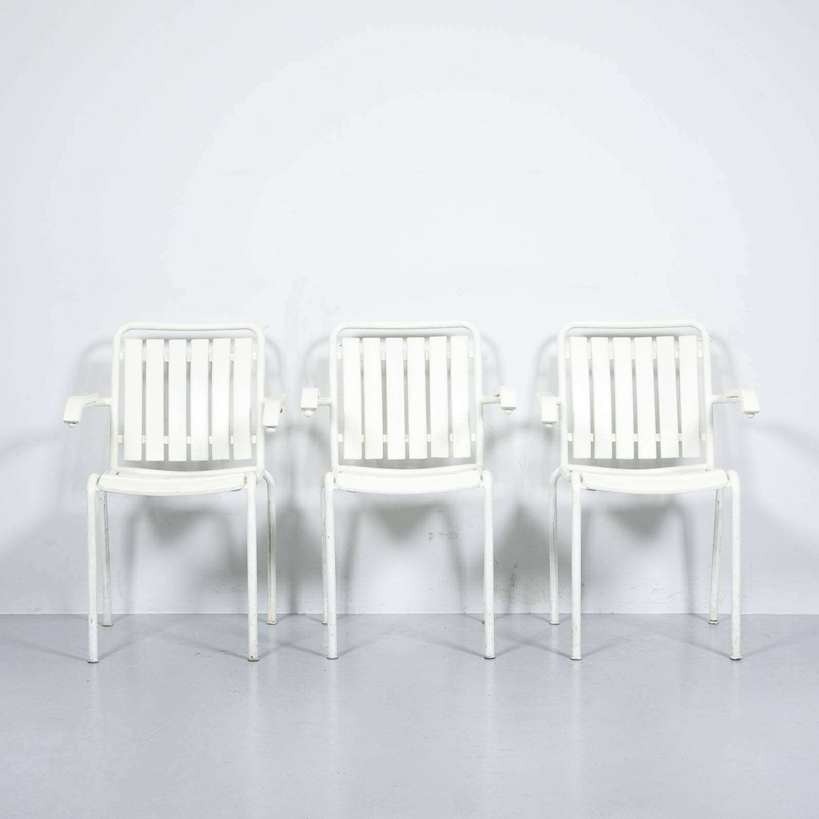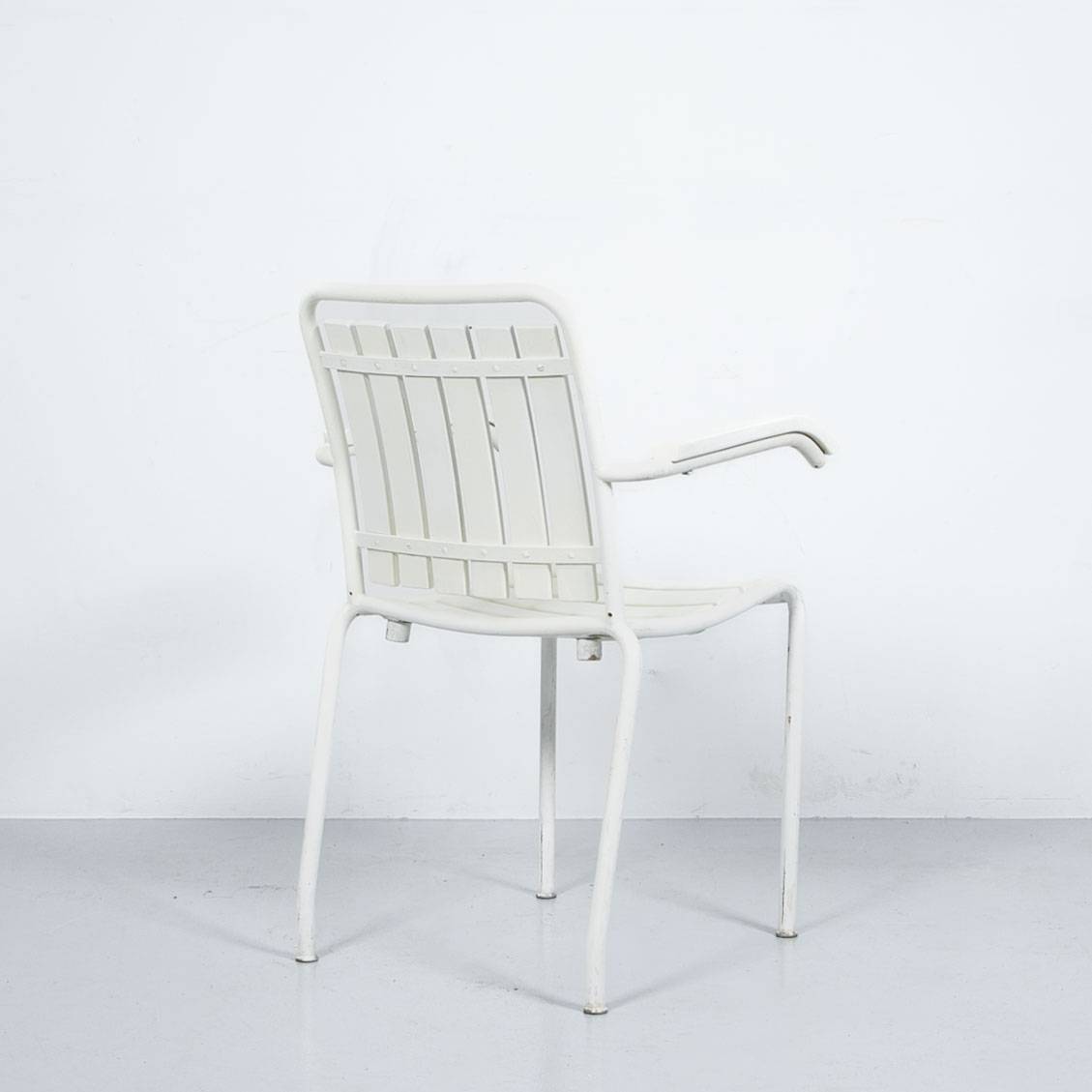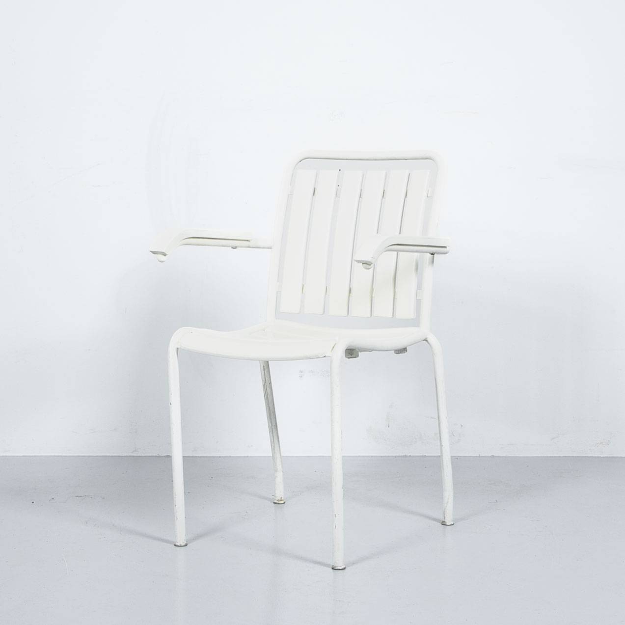 Weisser Gartenstuhl mit Armlehnen. Gestell aus weiss lackiertem Stahlrohr, Latten aus weiss lackiertem Massivholz. Mit Patina. Preis pro Stück. .