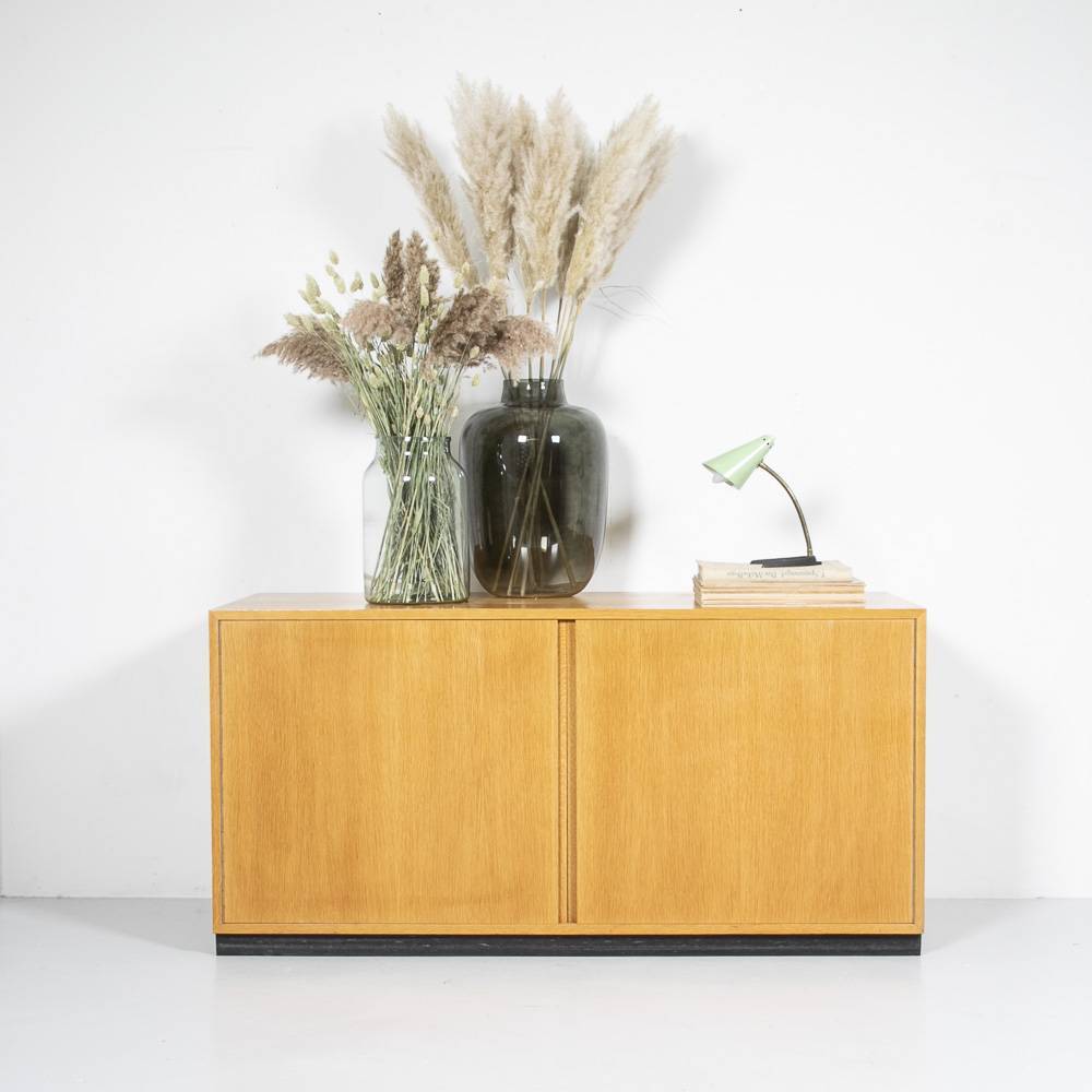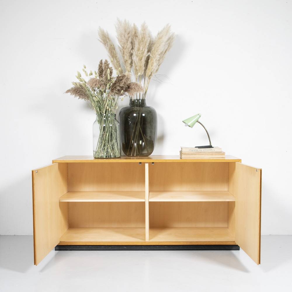 Zingg Lamprecht Sideboard auf schwarzem Sockel. Korpus und Türen mit Eichenholz furniert, innen mit Ahorn furniert. Zwei höhenverstellbare Tablare. Wenige Gerbrauchsspuren.
